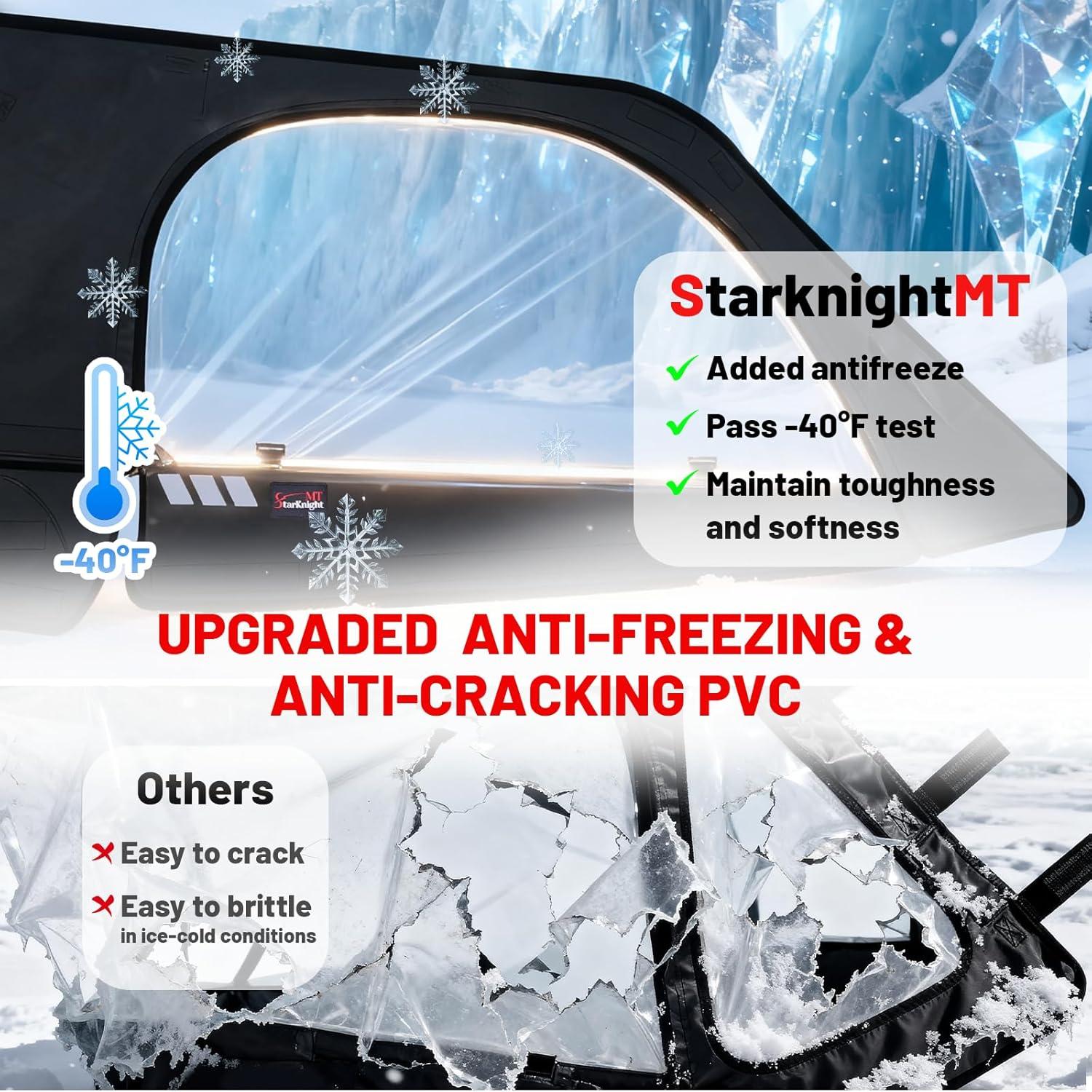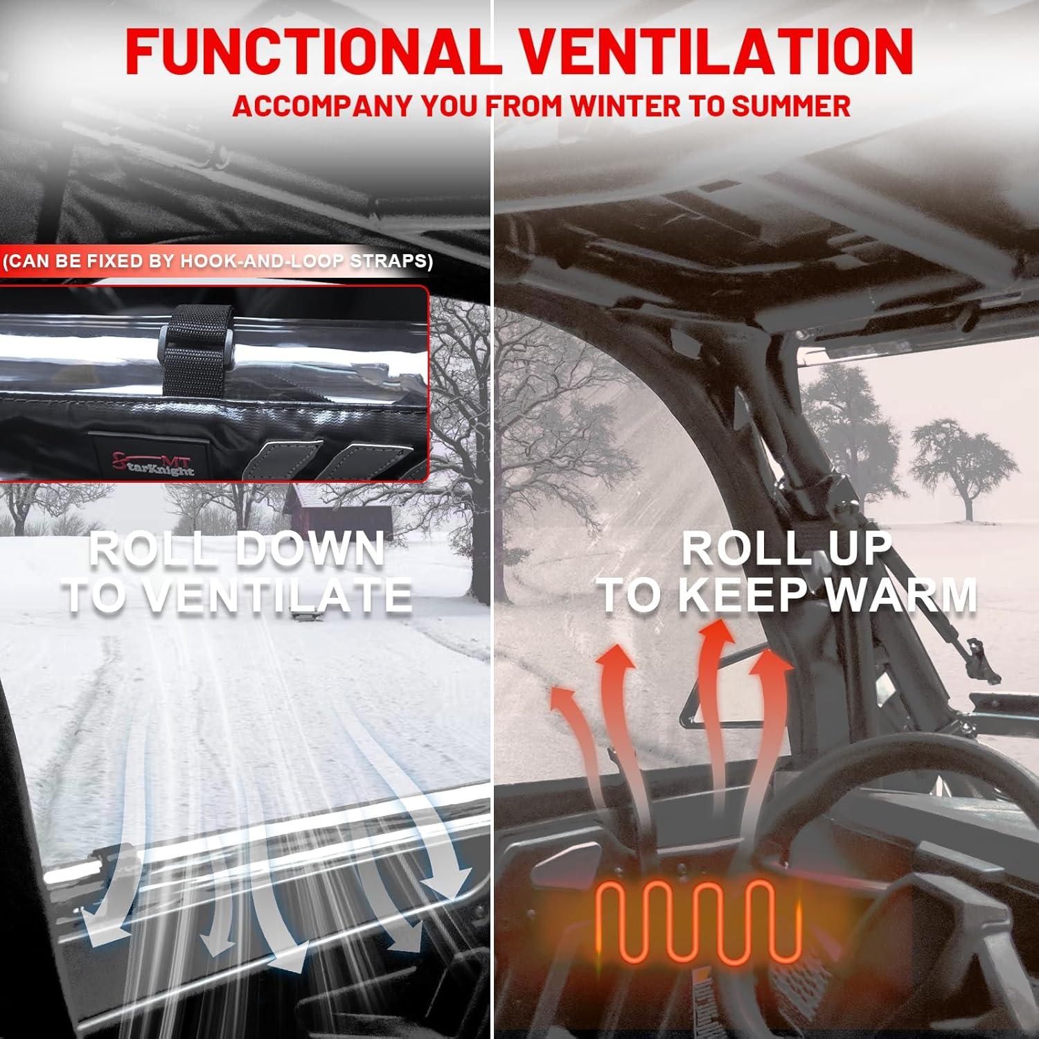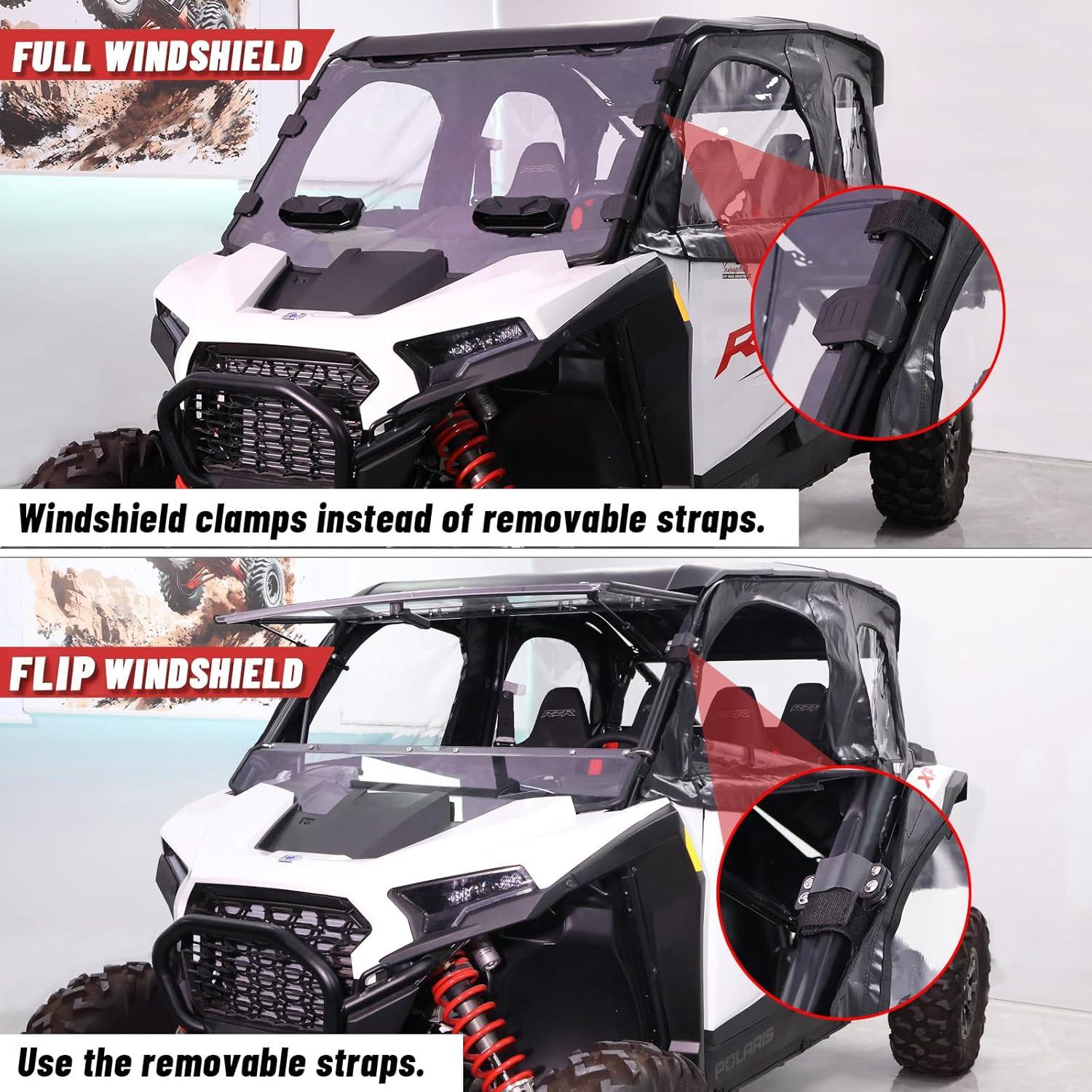 【USE WITH MOST ROOF & WINDSHIELDS】 Don't worry about incompatibility with full windshield and flip windshield from StarknightMT. Different installation details can be seen in the video on the page. First install the soft cab enclosure, then install the windshield. If windshield is pre installed, simply loosen the windshield clamp to install the soft cab enclosure straps,then tighten the clamps.
