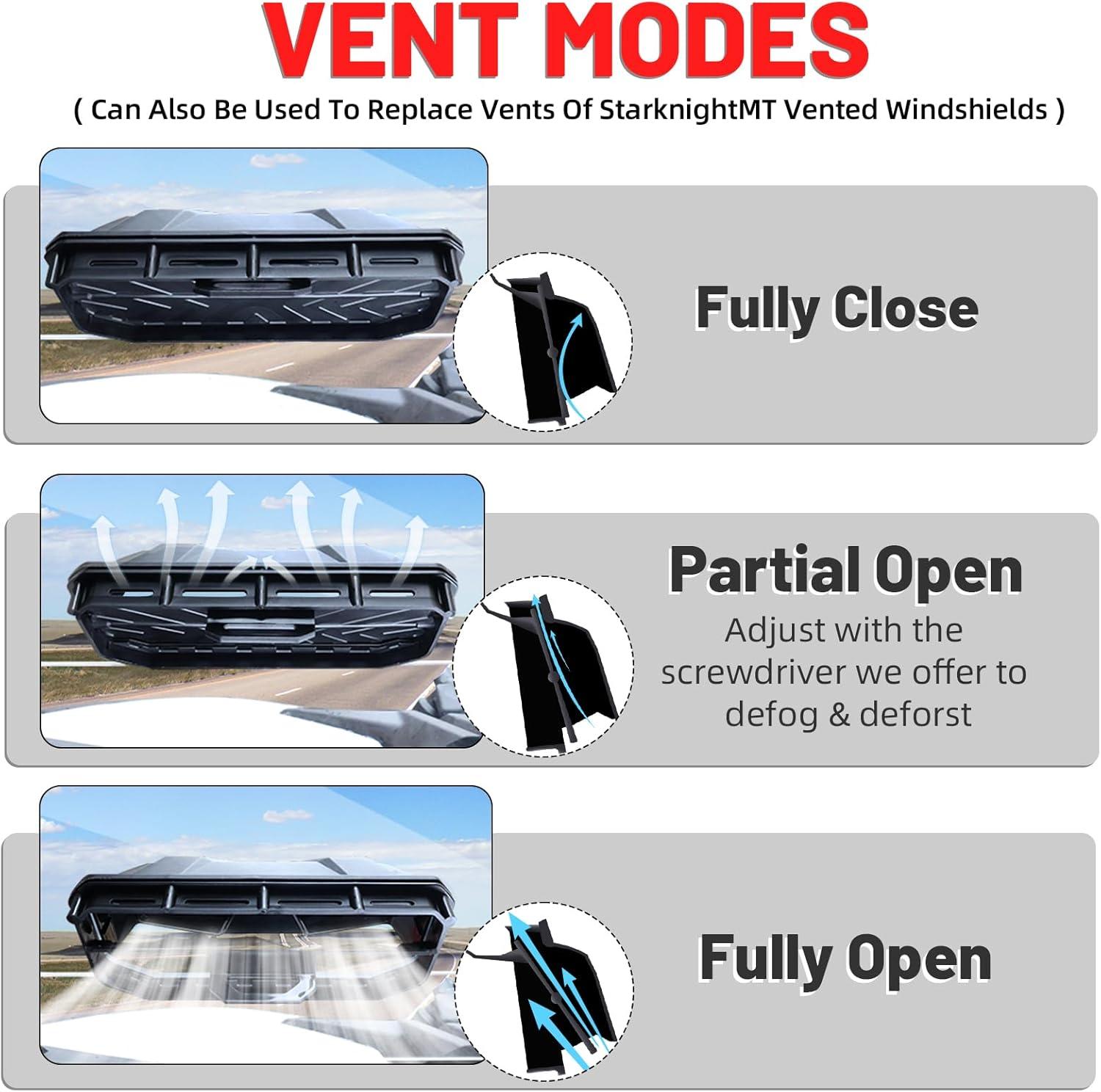 Adjustable UTV Vents: This set of windshield vent kits comes with a professional screwdriver to adjust the vent's open, which helps you adjust the side screws easily to set how tight you want the vent switch to be, and the top of this vent is designed with small ventilation channels for defogging, that means you can tilt the fan blades to the right opening angle for your needs and then adjust the screws to secure the vent fan blades