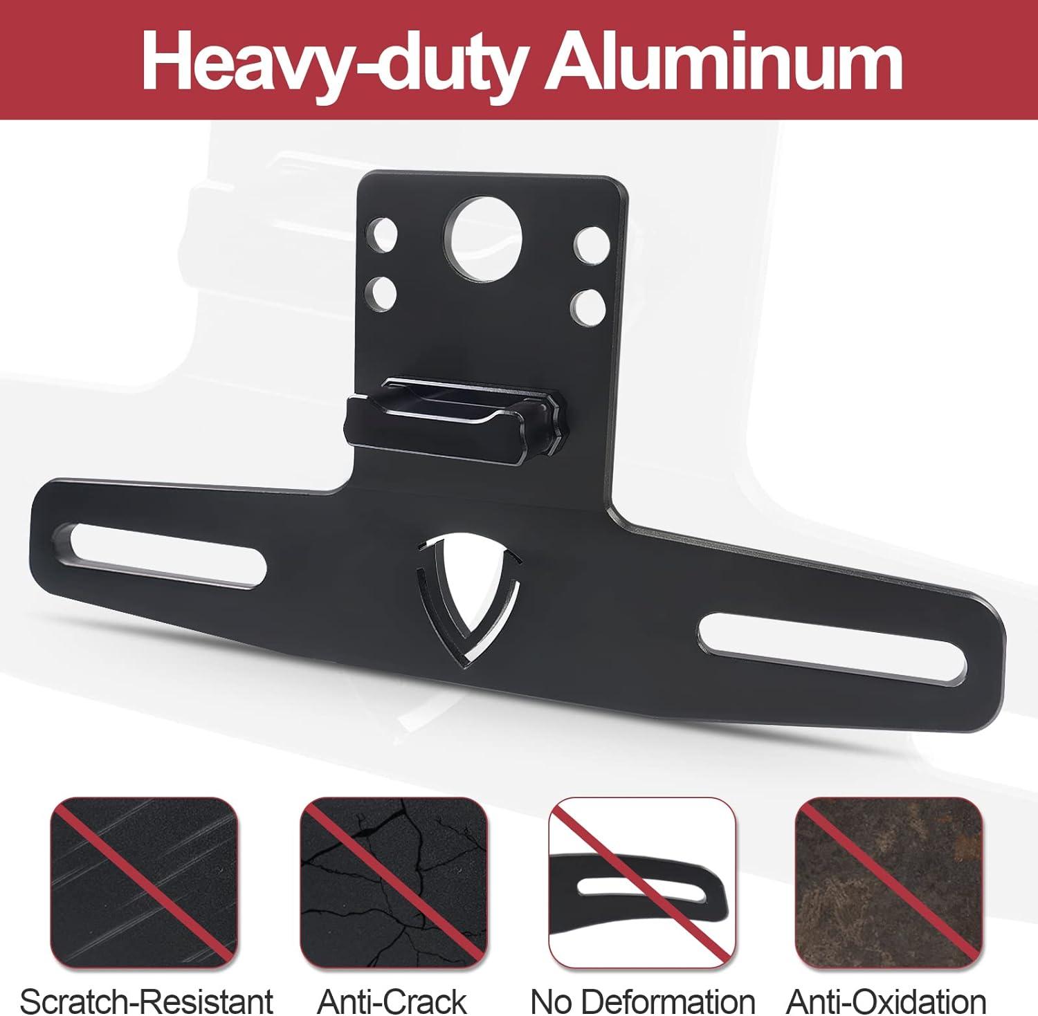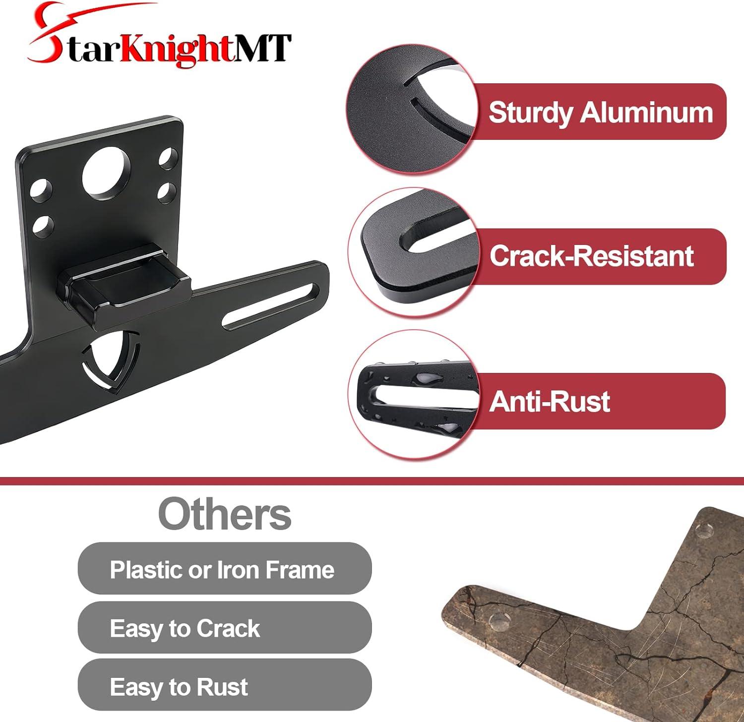 Heavy Duty Material: StarknightMT atv license plate mount, made of high-strength aluminum with black powder coating on the surface, is enough sturdy and solid to avoid crack, scratch, or deformation. It stays more stable than plastic in driving. also, the black powder coating can prevent corrosion and resists all kinds of weather conditions, making it a longer lifespan