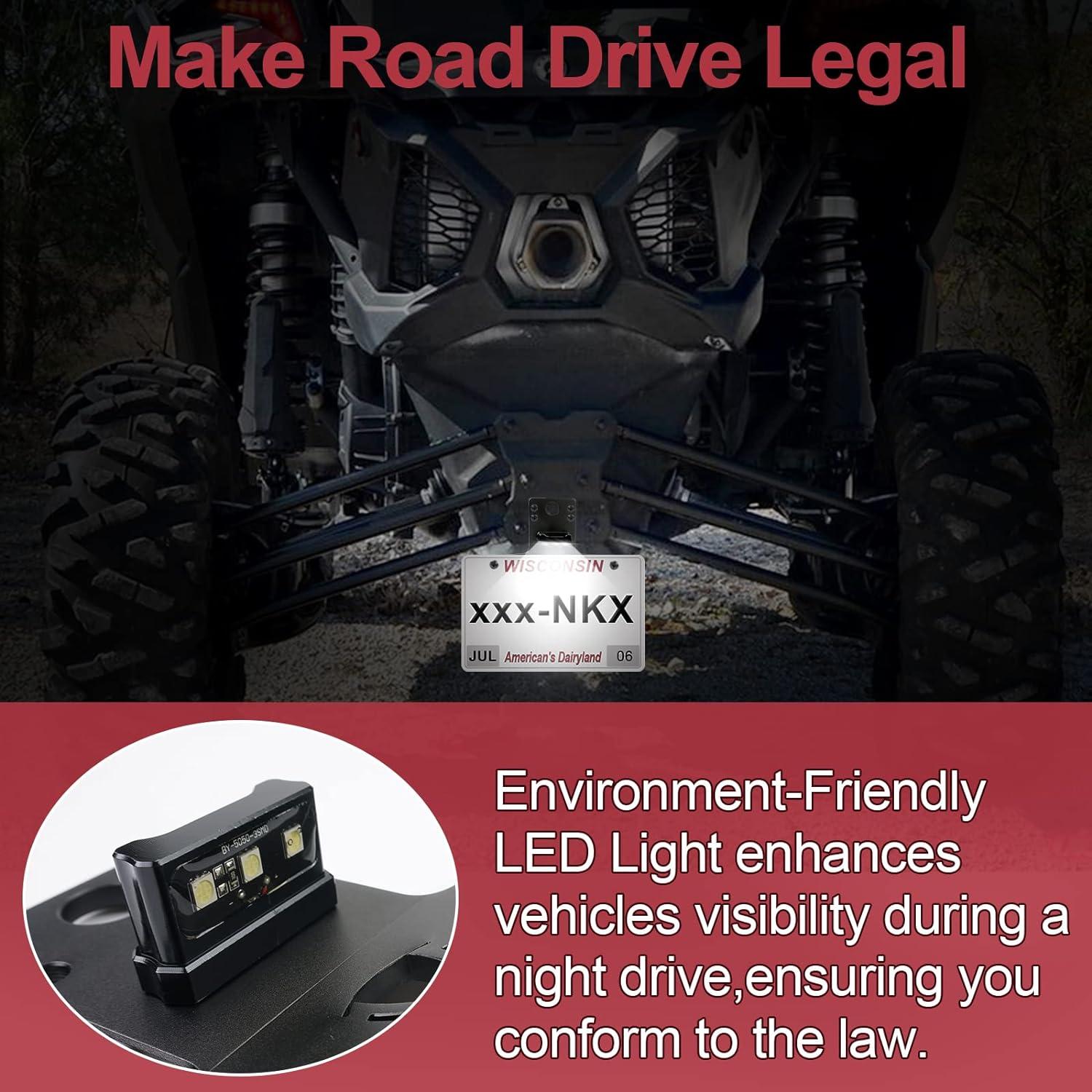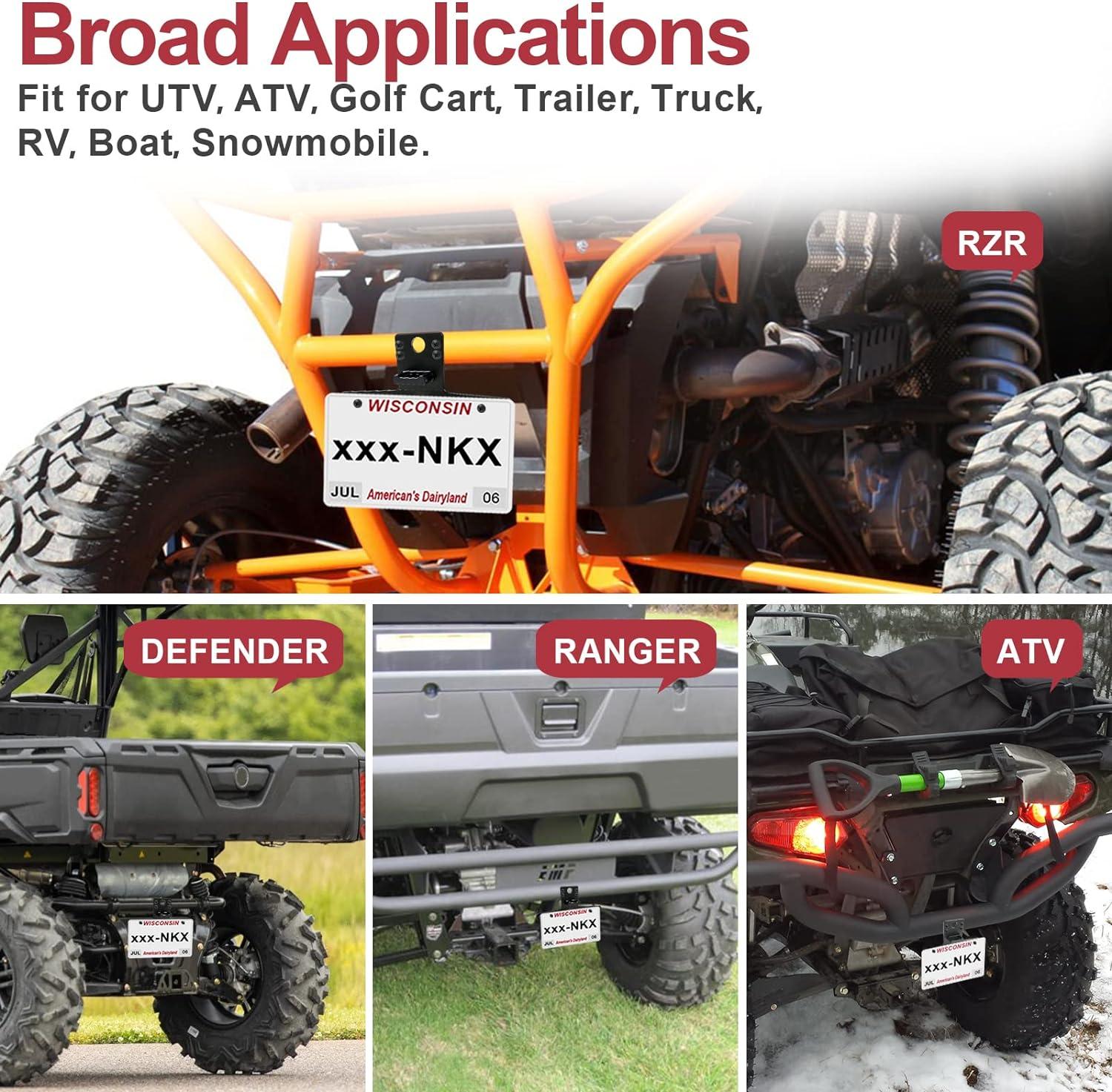 Universal Fit: This License plate holder universally fits for UTV, ATV, Trailer, RV, Truck, Boat, Golf Cart, Snowmobile, etc. For example, RZR General Ranger Maverick X3 Commander Defender trail Outlander Renegade DS SXS, and other UTV/ATV models