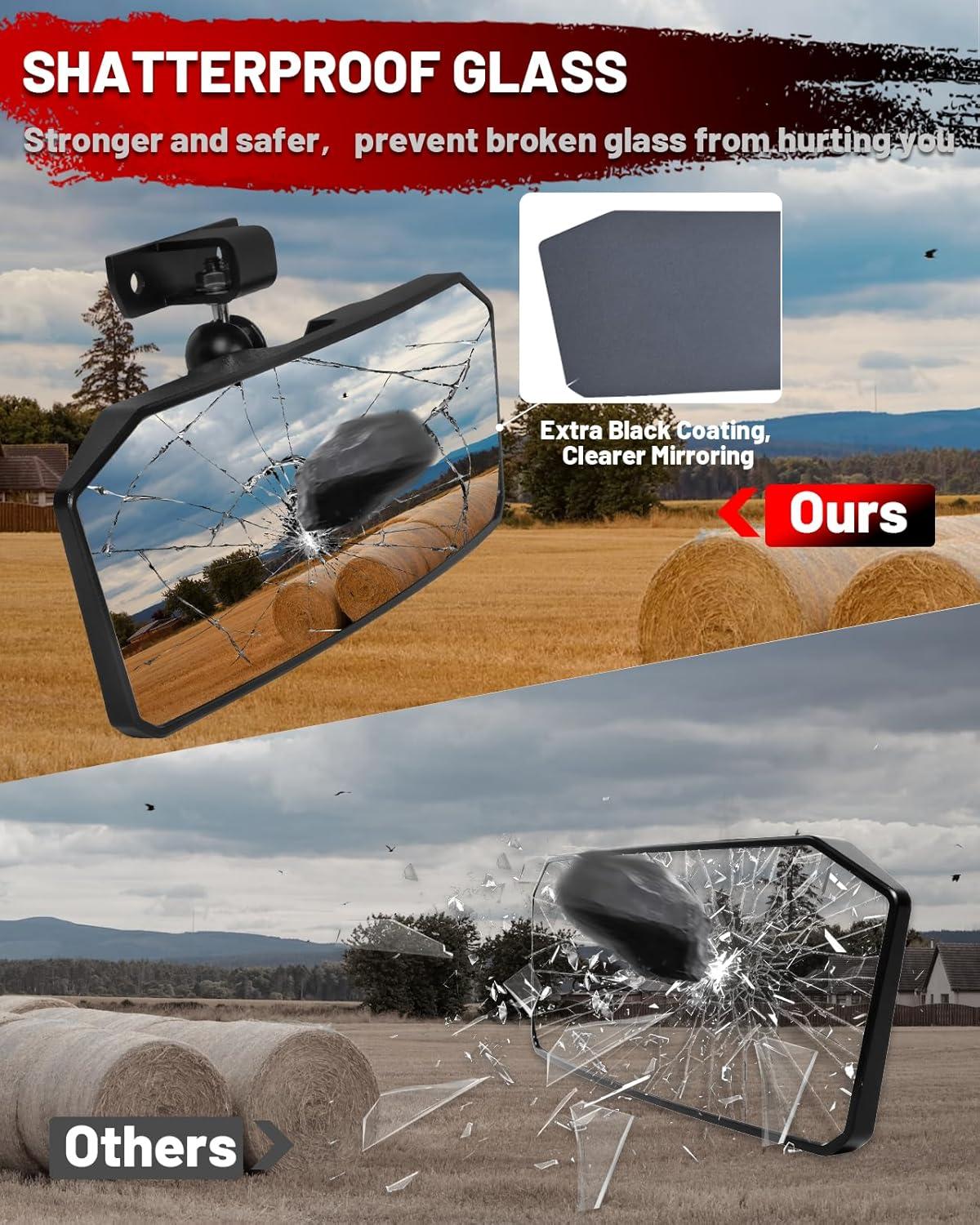 CREDIBLE QUALITY: High-quality shatterproof glass, stronger and safer than ordinary glass. UTV racing rear view mirror will stick together and won't splash and hurt you even if broken. High-density ABS housing design, not easy to be damaged or deformed. You will be impressed by its durability