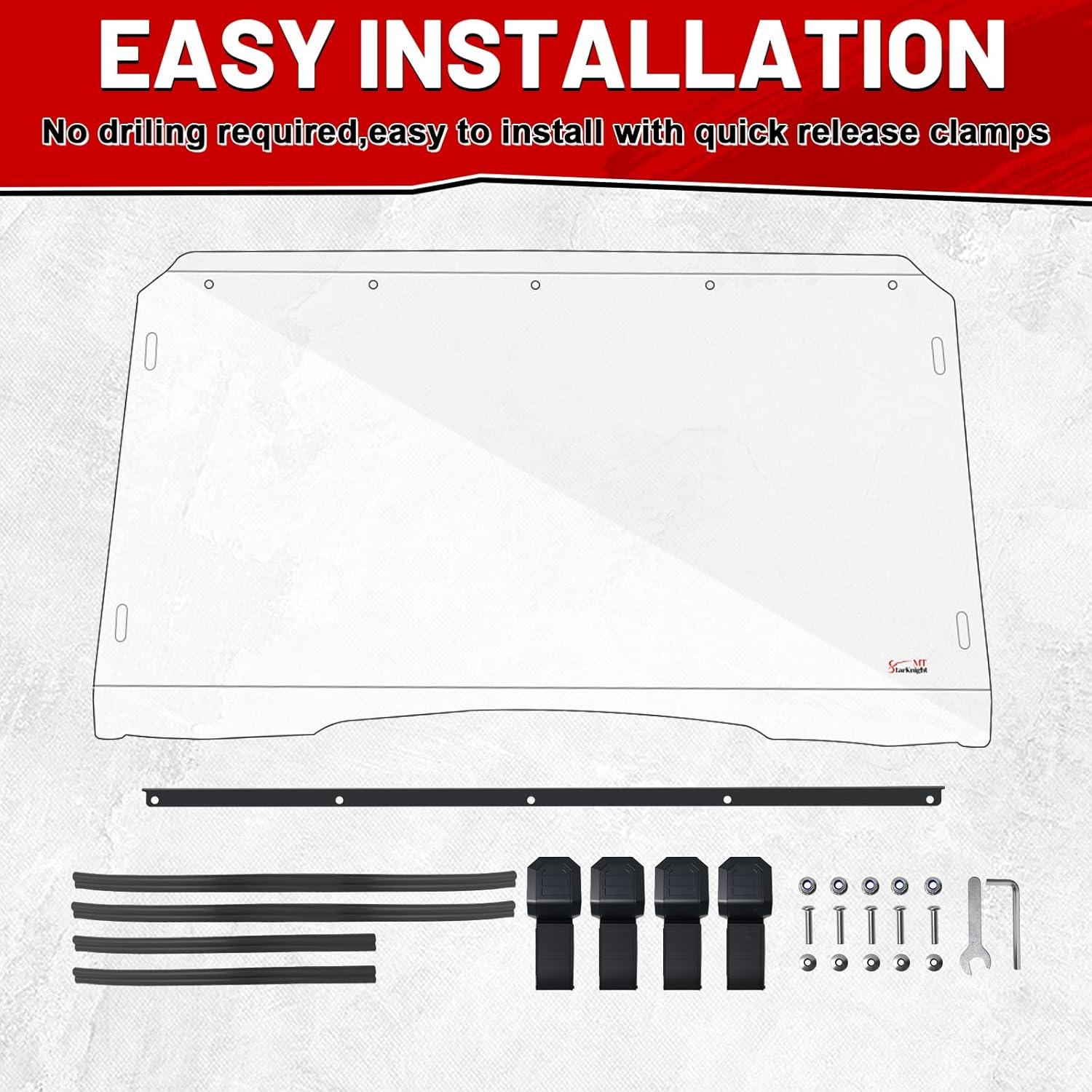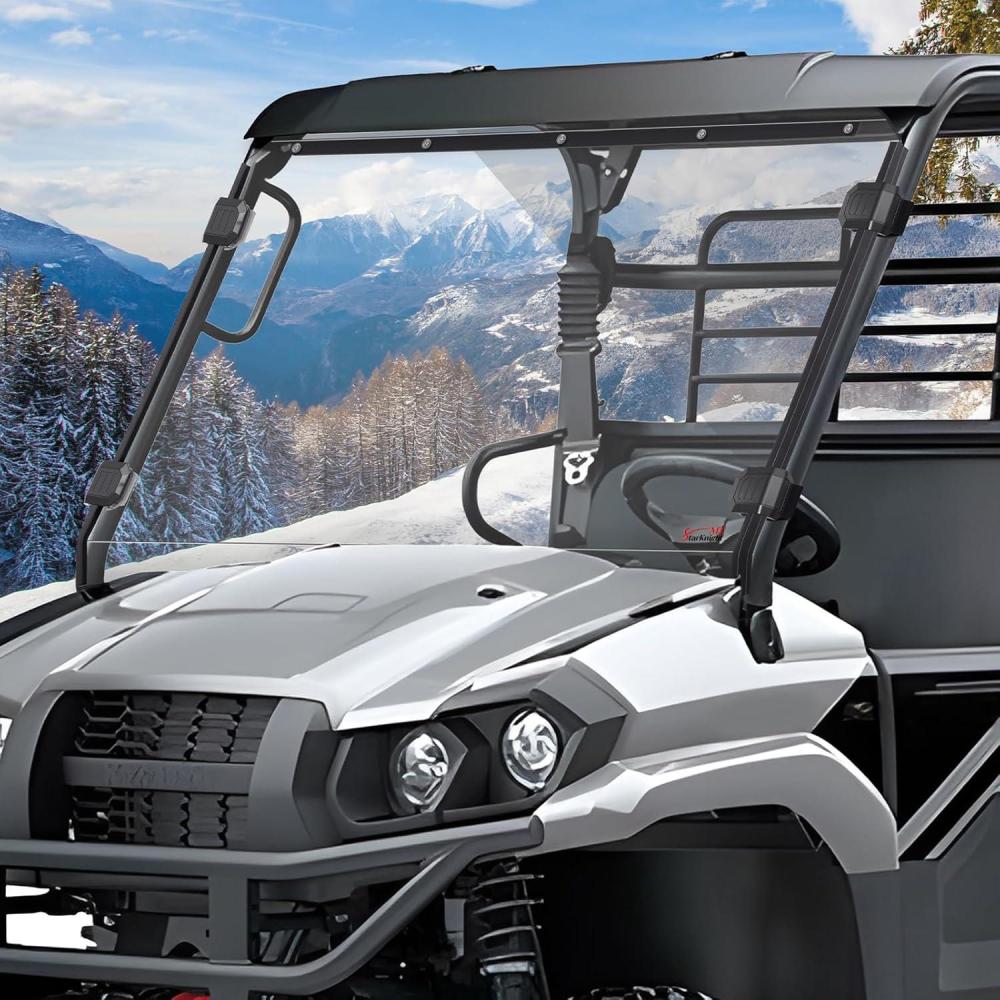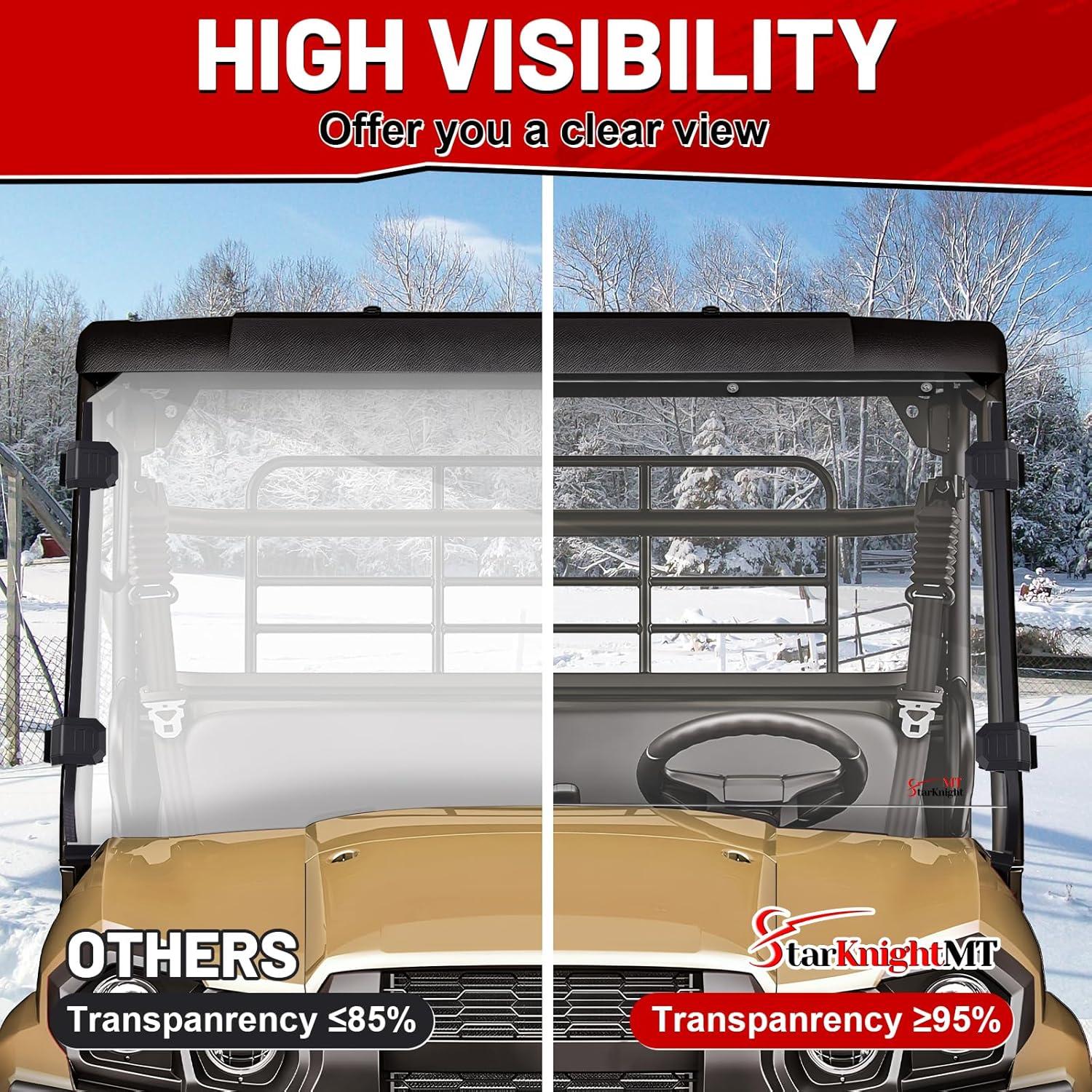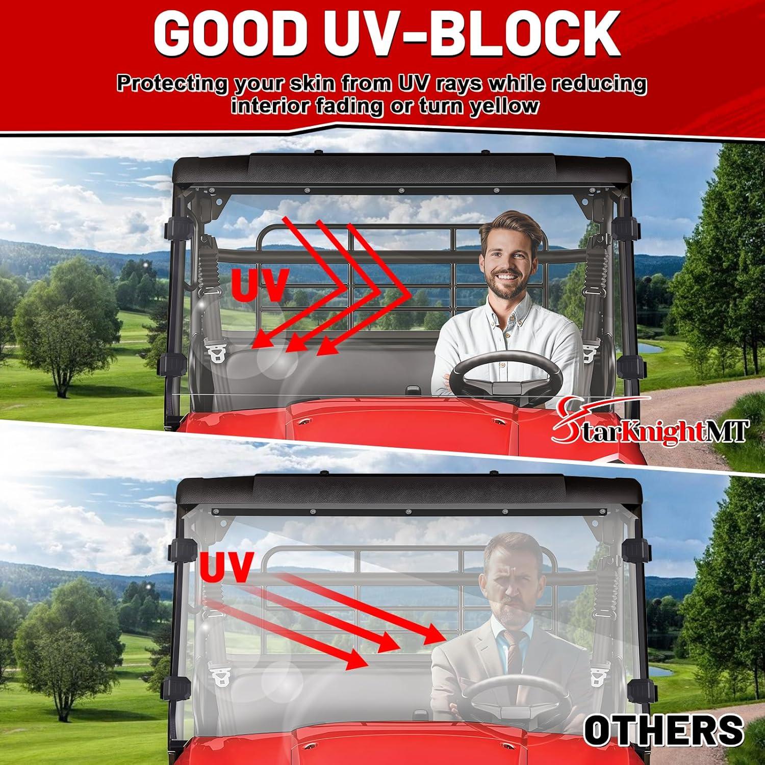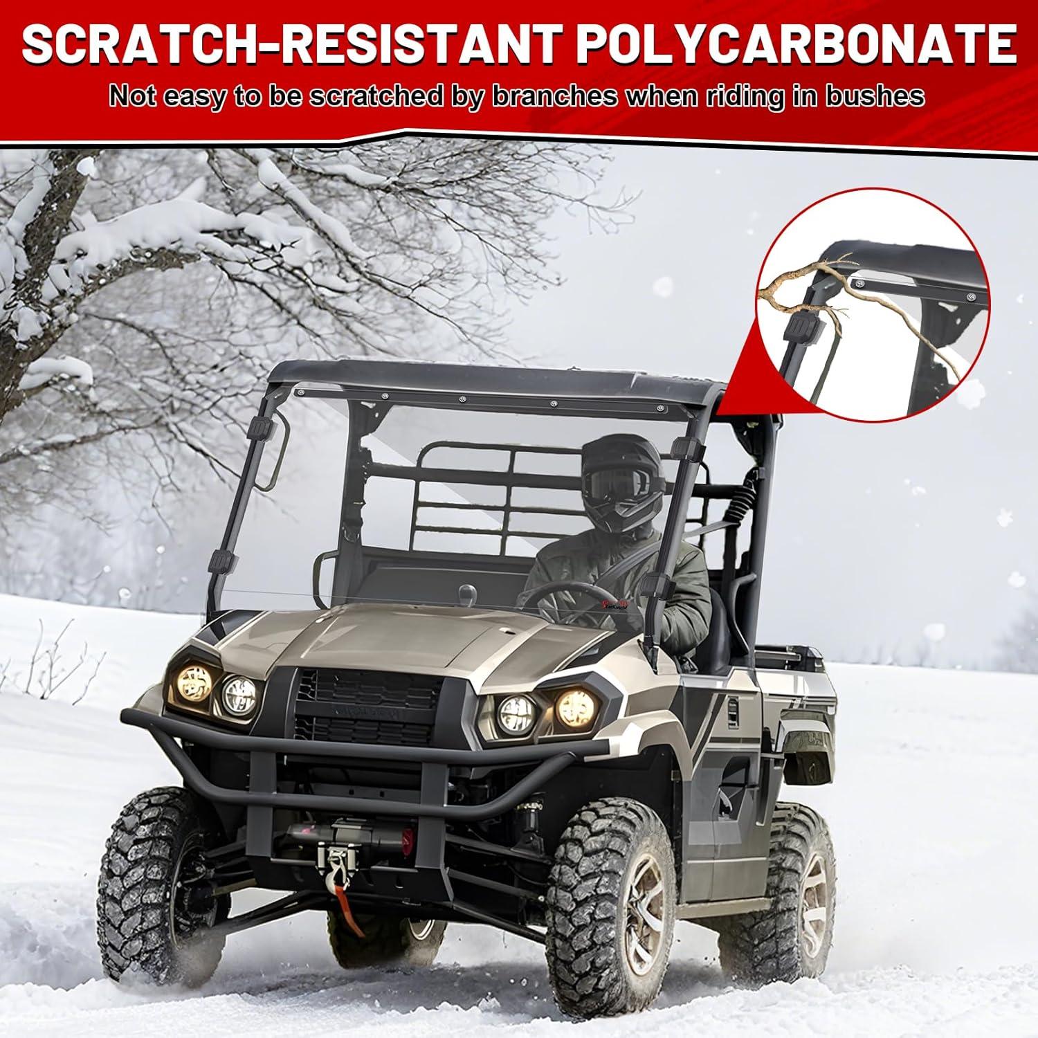 SCRATCH RESISTANCE: StarknightMT front windscreen compatible with Kawasaki Mule pro mx windshield front is made of scratch-resistant polycarbonate material, not easily scratched by branches or stones while driving. The UV-blocking coating design can offer good UV protection for you. StarknightMT PC windshield heavy-duty can effectively shield against harmful sunlight, protecting the skin of both the driver and passengers while reducing interior fading