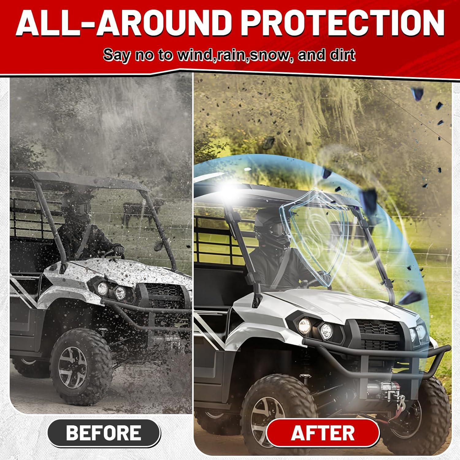 CLEAR VISIBILITY: The Mule windshield features high light transmittance, which can be up to 95 percent. Hard coated PC window compatible with Kawasaki windshield Mule pro mx will offer you a clear and unobstructed view,ensuring a safe driving for you in tough weather