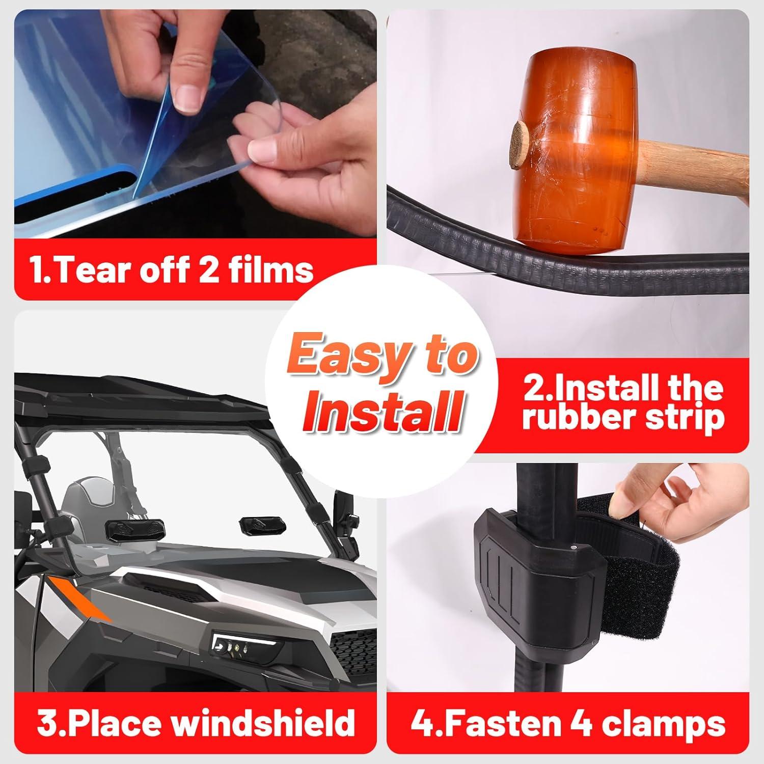 【Easy Installation】The General 1000 front full windshield can be installed securely with the clamps, you can complete installation by yourself in a few minutes, whether you refer to the instruction manual or not, and there are no drilling and other extra tools needed. What's more, this windshield can fit most roofs, you don't need to worry about the windshield will bother the roof's installing
