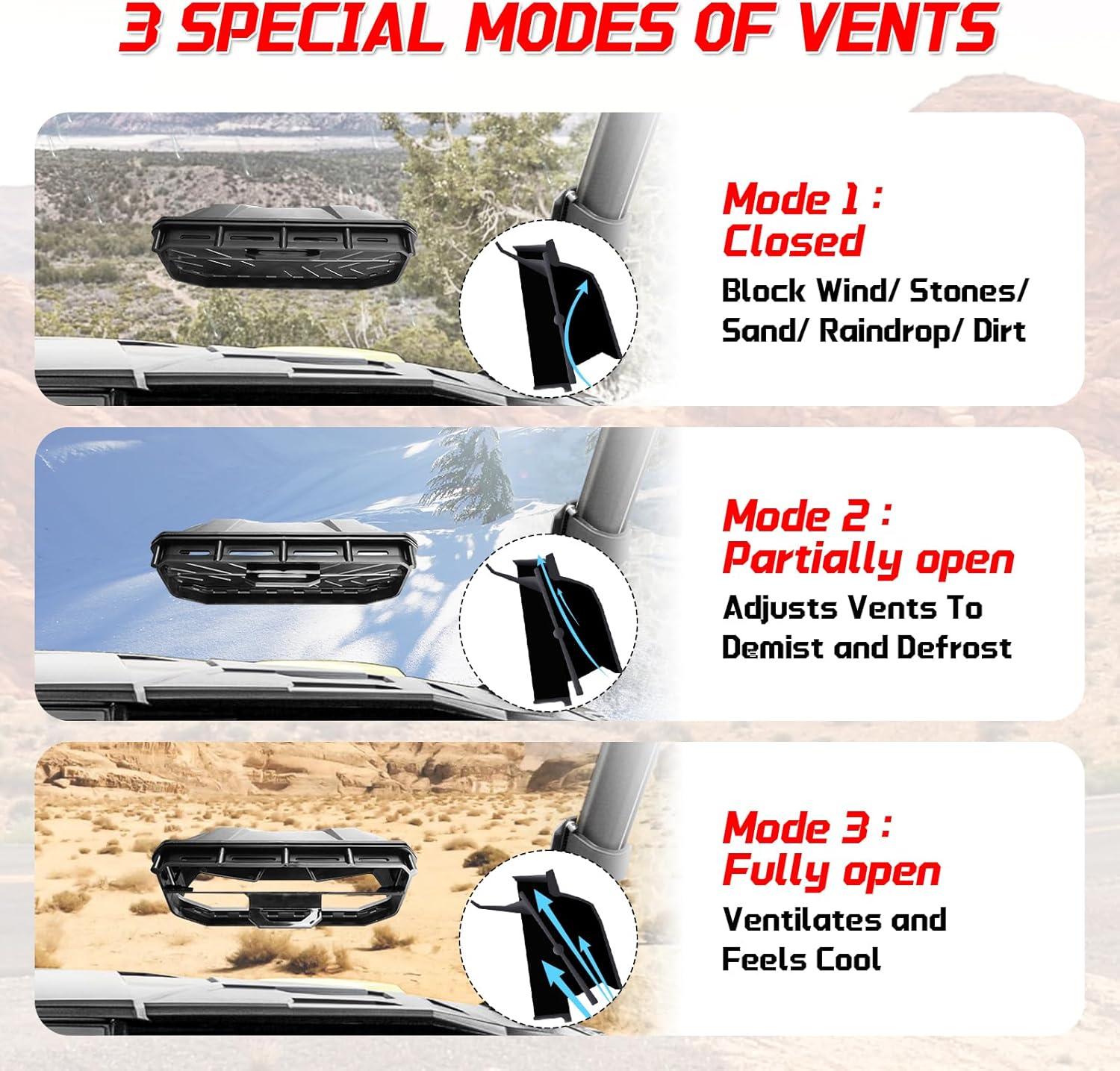 【Vents For Defog & Deforst】This General 1000 front window is equipped with two vents which help allow really nice airflow and keep your rides cooler in your UTV on hot days, if there is a temperature difference between the inside and outside of your UTV, you can open the vents a little to minimize fogging or frosting on the window and ensure your drive is much safer
