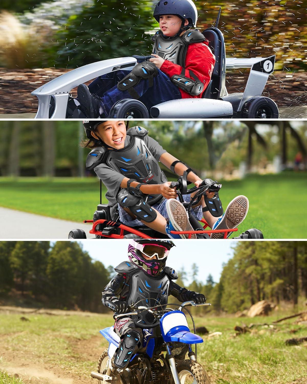 Broad Use: This kid's motocross protective gear is suitable for motorcycles, skateboarding, skiing, skating, snowing, dirt bikes, scooters, electric cars, electric off-road motorcycles, go-carts, ATVs, UTV, etc. any outdoor sports, and especially for vehicles with speed; The kid's motorcycle gear includes a chest protector, a pair of knee pads, and a pair of elbow pads