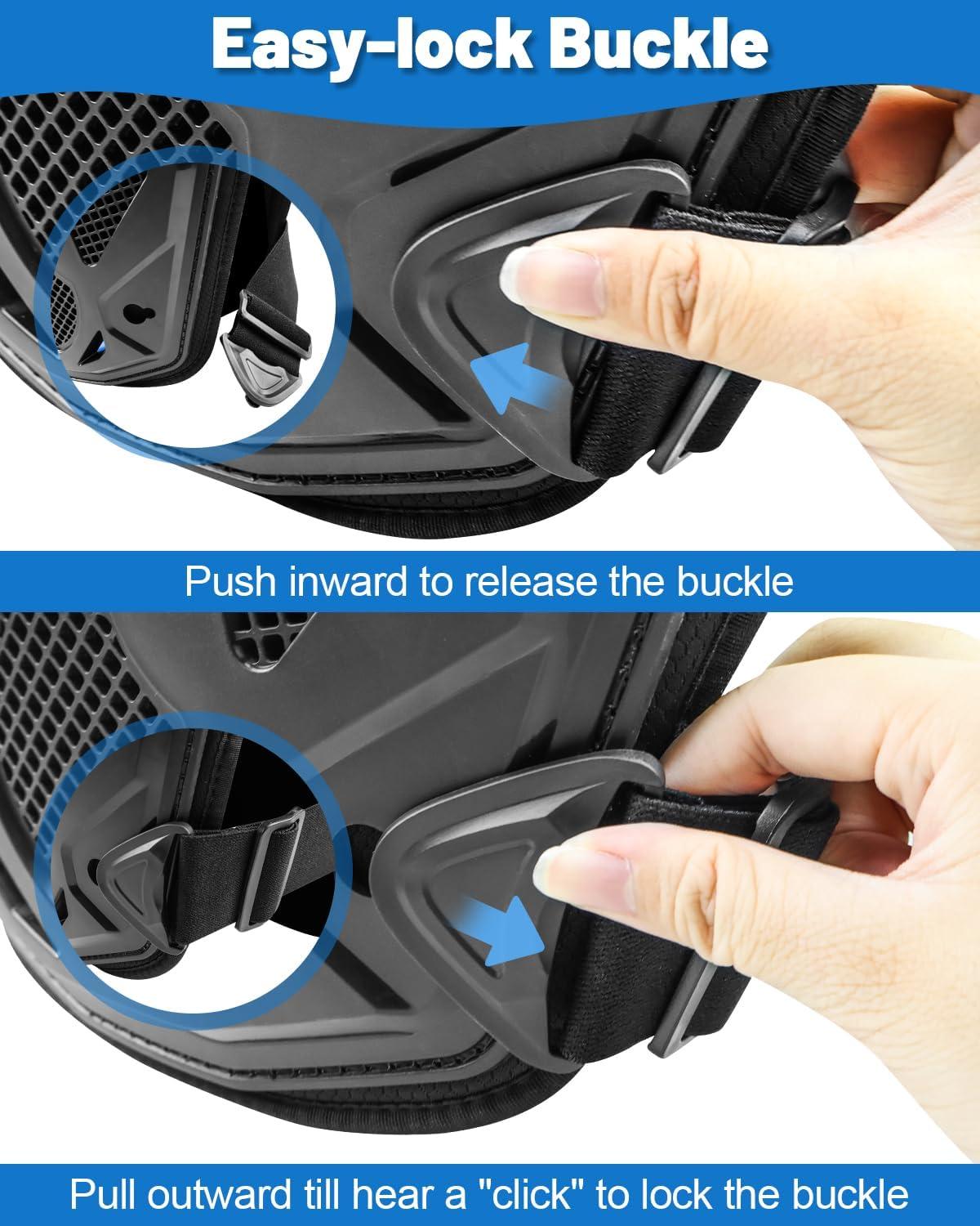 Upgraded Easy-Lock Buckle: This youth dirt bike chest protector is upgraded by two slide-buckles with adjustable straps, which is easier to buckle and adjust; The knee and elbow pads are also equipped with the design of the hook and loop fastener for your kids to wear easily; It provides a great room for your kids for a long time use and provides all-around protection for children