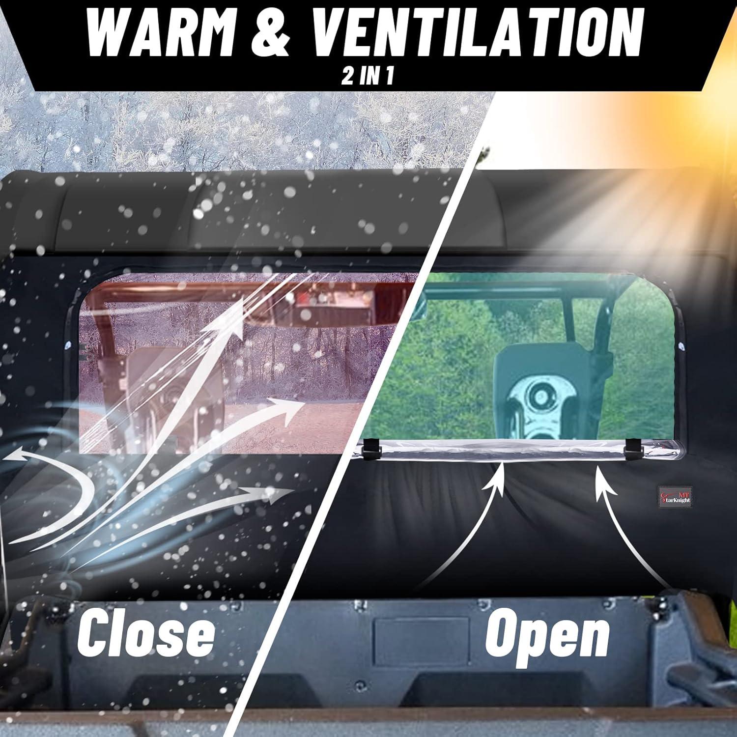 Zipper Window Design: The transparent zip-down panel provides excellent visibility and unzips the mid-window portion and rolls up without having to remove it if you have passengers in the back seat. Also, you can unzip the transparent panel in summer to allow air to come in and keep the cab cool; Close it to keep warm in chilly winter, and close it to keep dust, rain, snow out