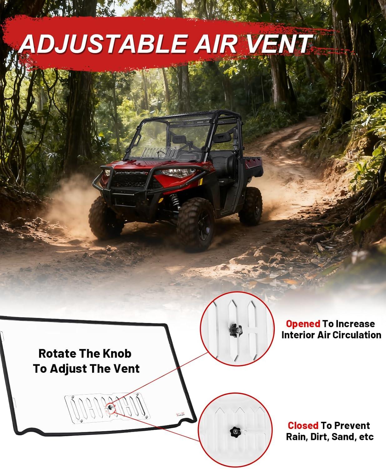 【Sliding Vented Design】The ranger 1000 full windshield is designed with a big sliding window, it can be adjusted easily by the knob, it combines the advantage of full windshield and half windshield, maintaining ventilation while providing full protection, you will enjoy more comfortable driving with it.