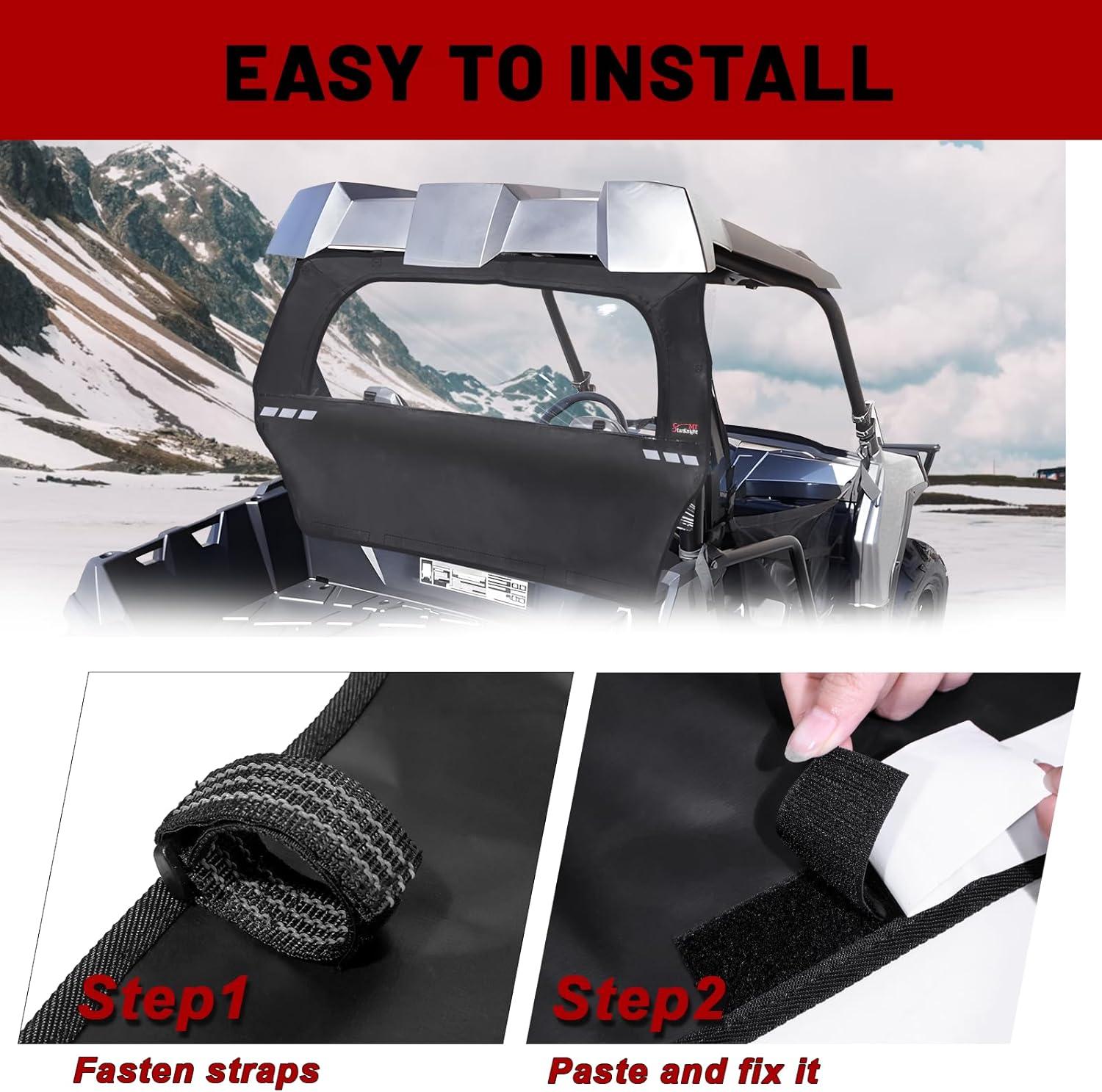 EASY INSTALLATION: Just need to secure the top and side straps of the rzr rear window to your RZR roll cages and paste the bottom sticker; It only takes a few minutes to install