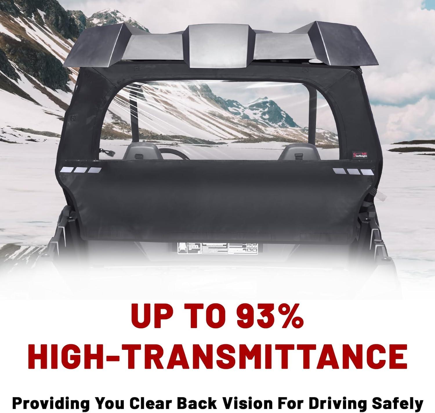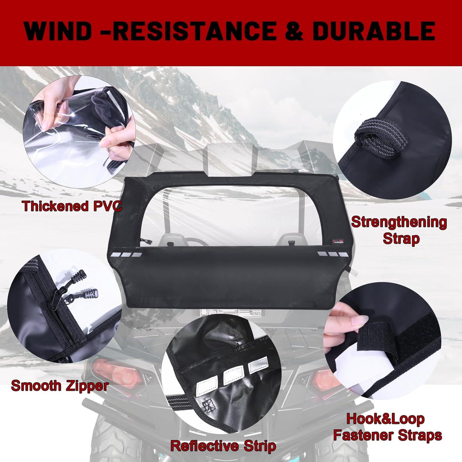 UPGRADE ZIPPER For VENTILATION: The RZR soft rear windshield is equipped with an upgraded waterproof zipper, which blocks cold and rain in winter outstandingly while getting ventilation on hot days; When it gets warm, you can roll up the PVC window and fasten by the bottom fastener and no need to remove the rear windshield