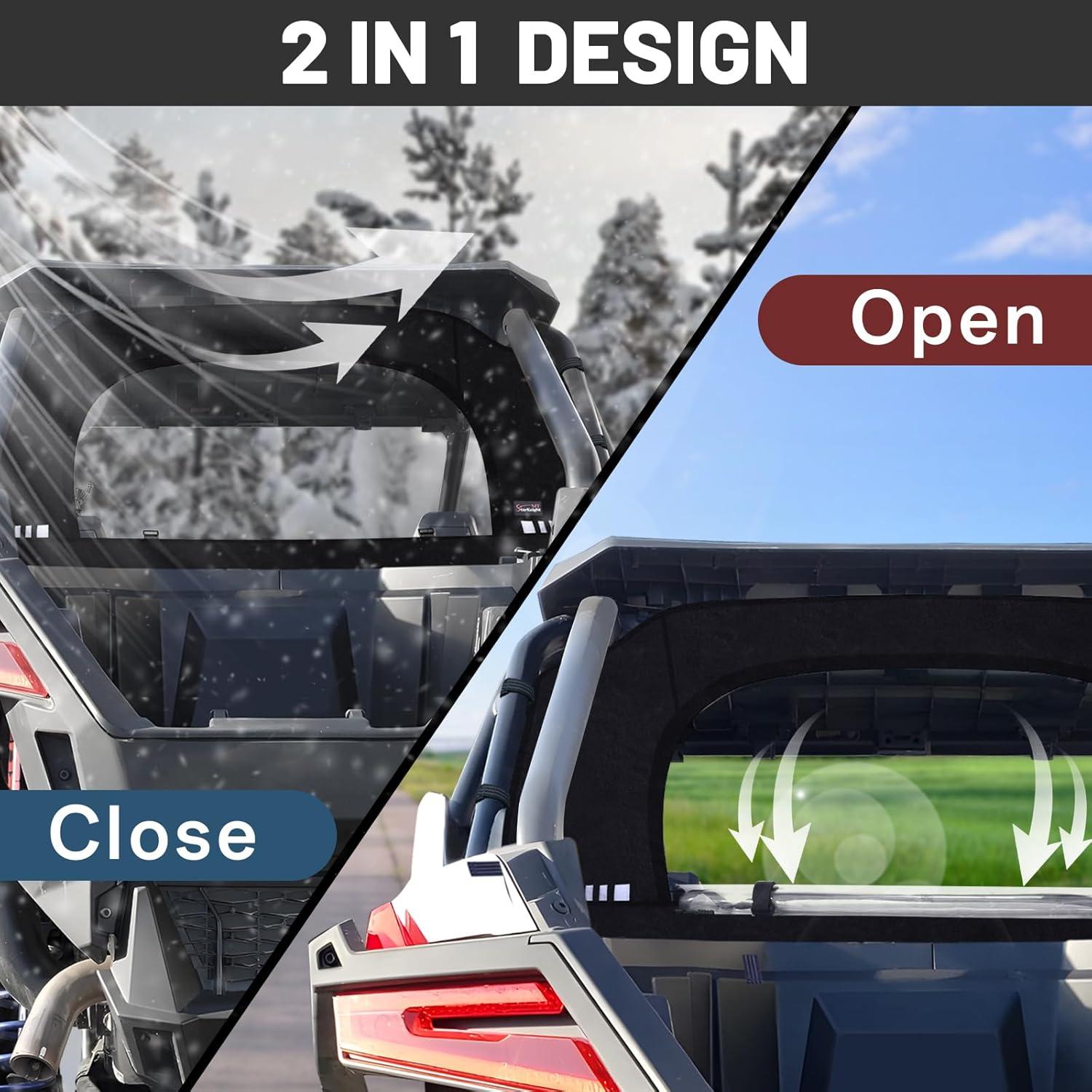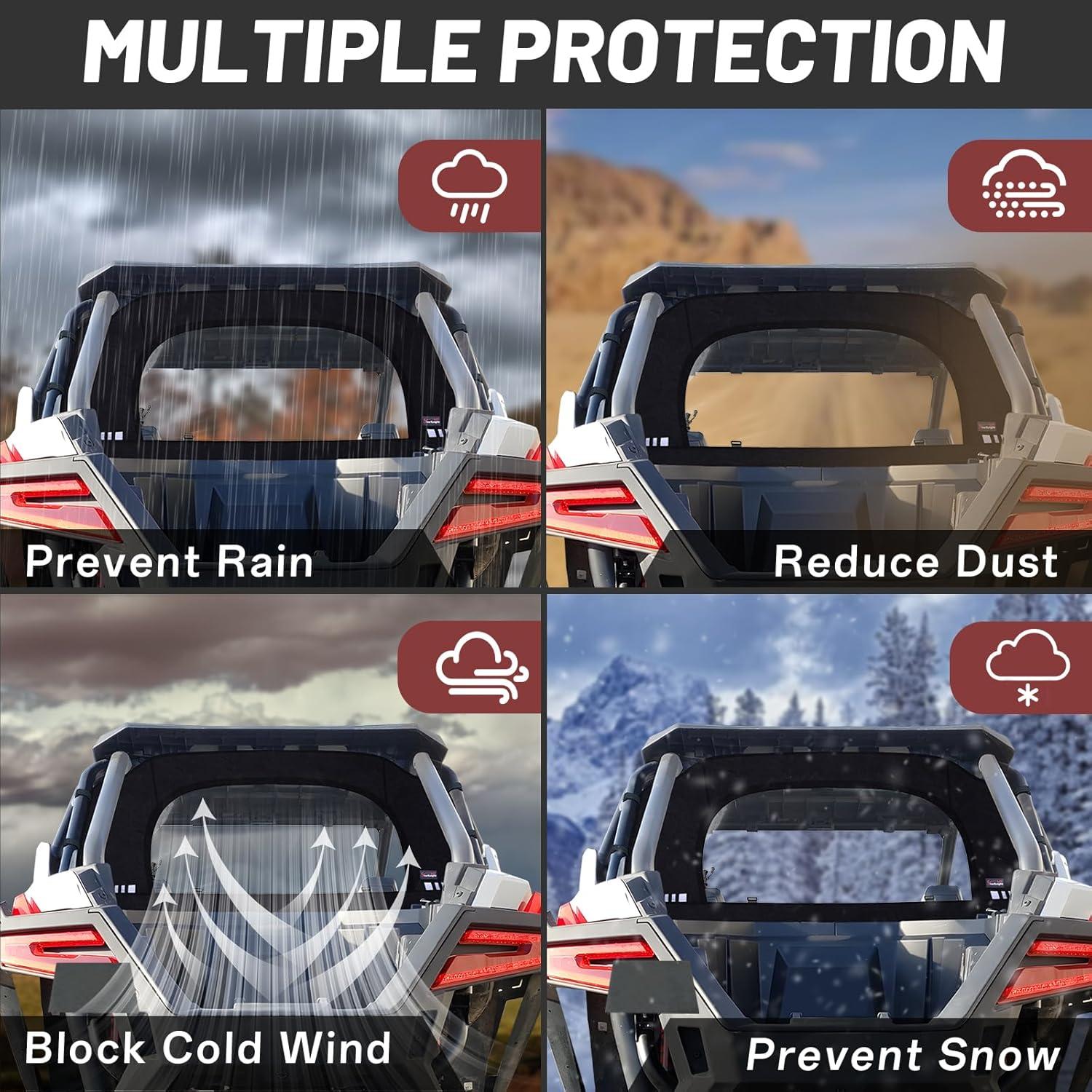2-in-1 Window: The rzr windows dust panel provides excellent visibility and unzips the mid-window portion and rolls up without having to remove it. You can roll up the transparent panel in summer to allow air to come in and keep the inside cool; Close it to keep warm in chilly winter, and close it to keep dust/rain/snow out