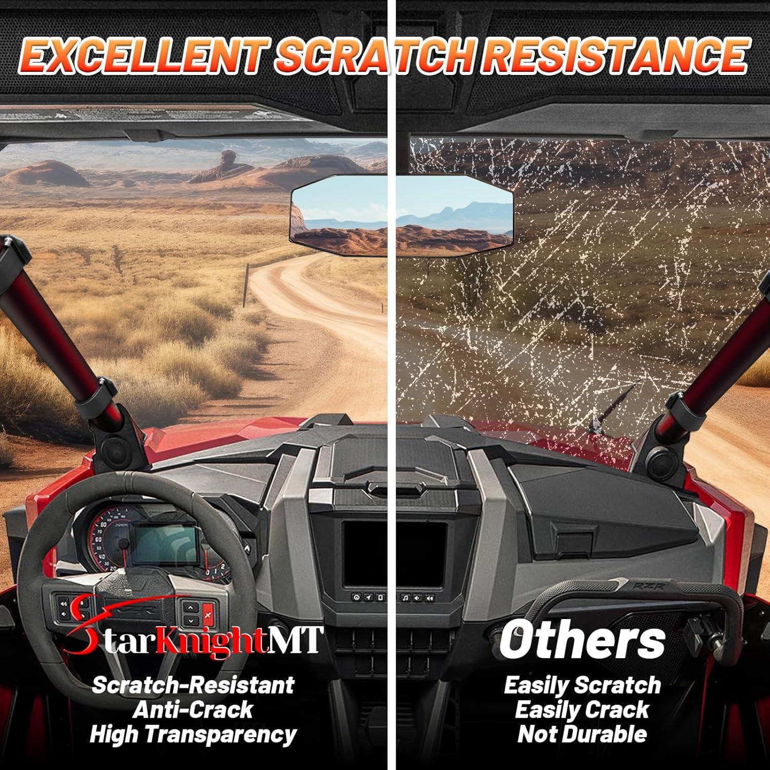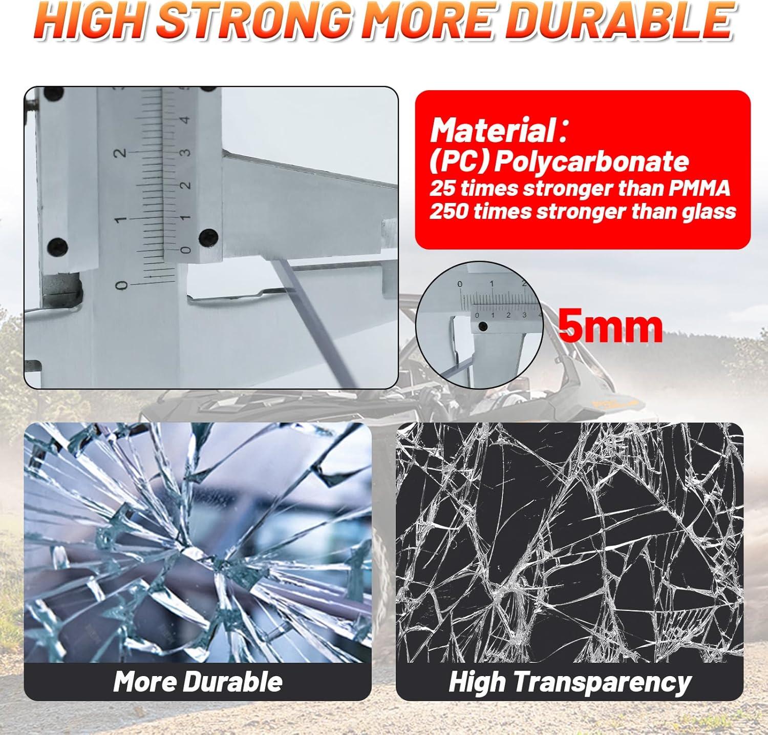 【Premium Material】 Each utv windshield is made of high performance polycarbonate, offering greater frost resistance and durability. More scratch-resistant than ordinary. 250 times strenger than regular glass, 25 times stronger than acrylic