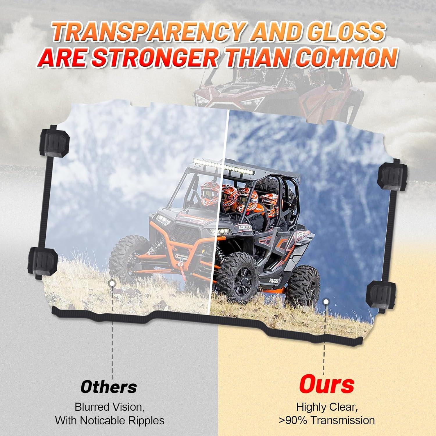 【Clear Vision】95% light transmission – ensuring a safe driving in tough weather. The rzr pro xp windows is close to the effect of the field of view without a mirror, very clear. Anti-UV radiation, providing you with great visibility and preventing sunburn on a hot day. Effective protect the seat from sun spots, yellowing, and fading too