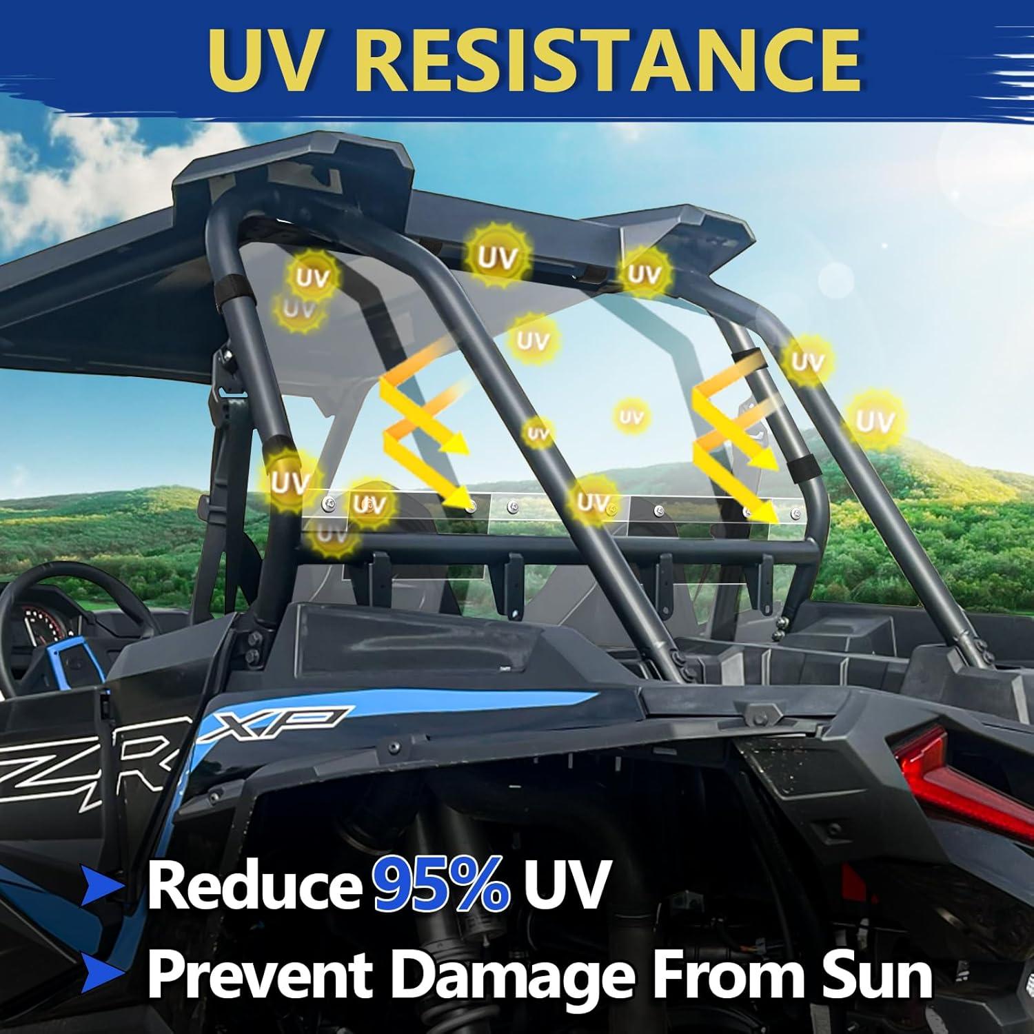 UV RESISTANCE: The rzr rear windshield features uv coating surface. It reduces uv radiation to the driver and cab from sunlight and prevents damage from the sun, so the vehicle's inner parts won't turn yellow or fade in the long term