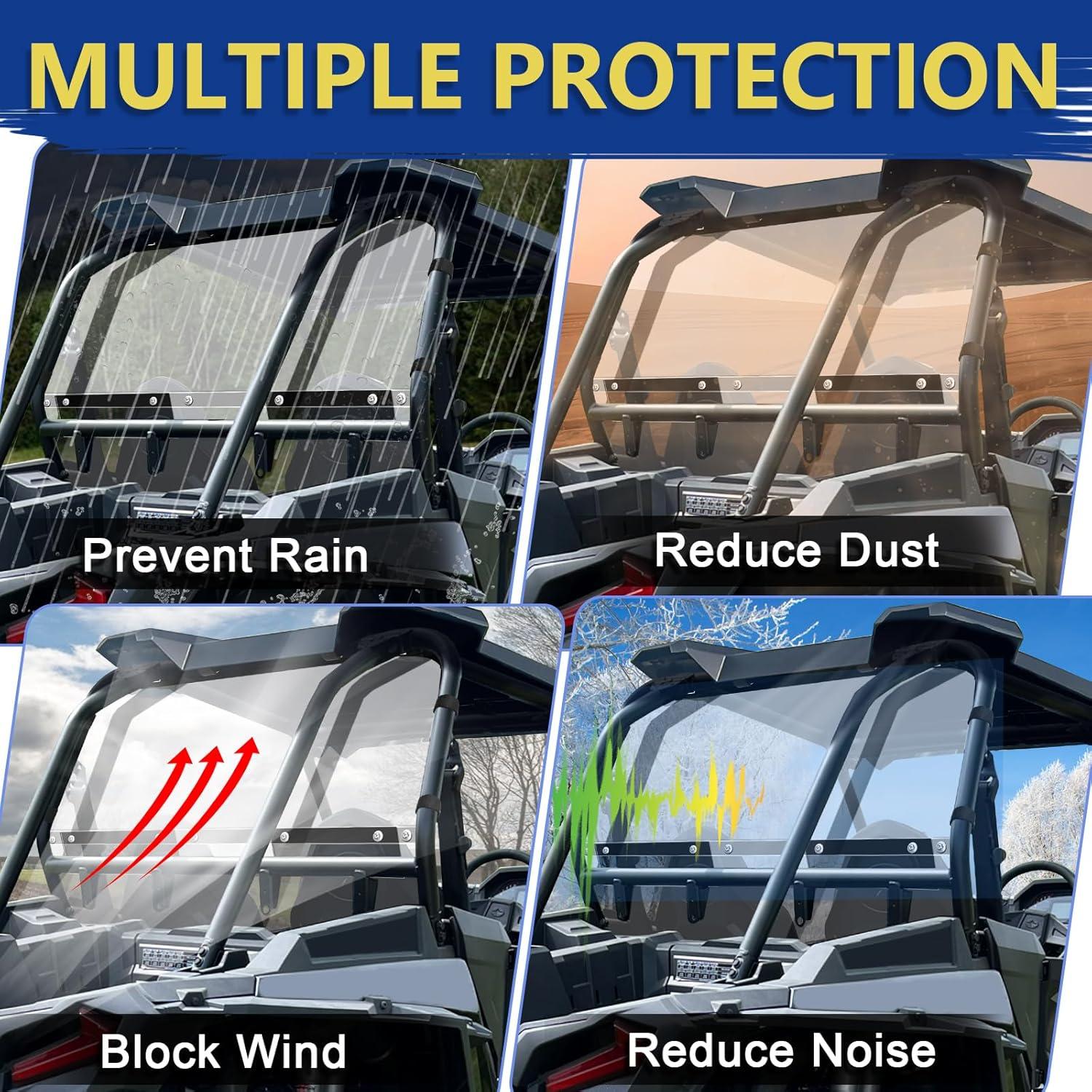 HEAVY-DUTY MATERIAL: The rzr xp 1000 windshield is made of premium polycarbonate with double sides hard coated and is 25 times stronger than PMMA, and 250 times stronger than glass. Enable the rzr Windscreen UV-resistant, shatterproof, shockproof, and sunproof