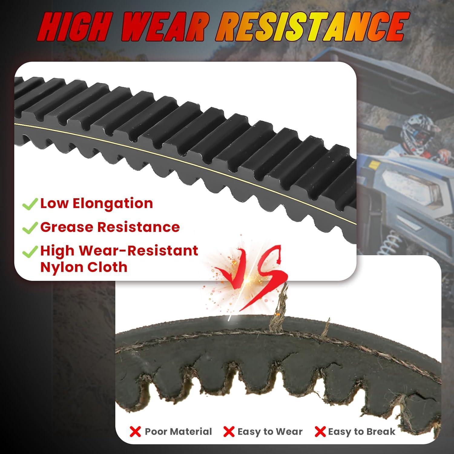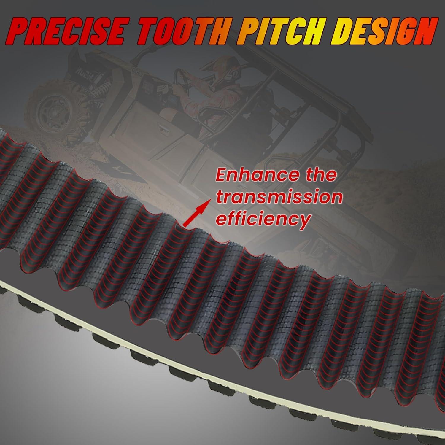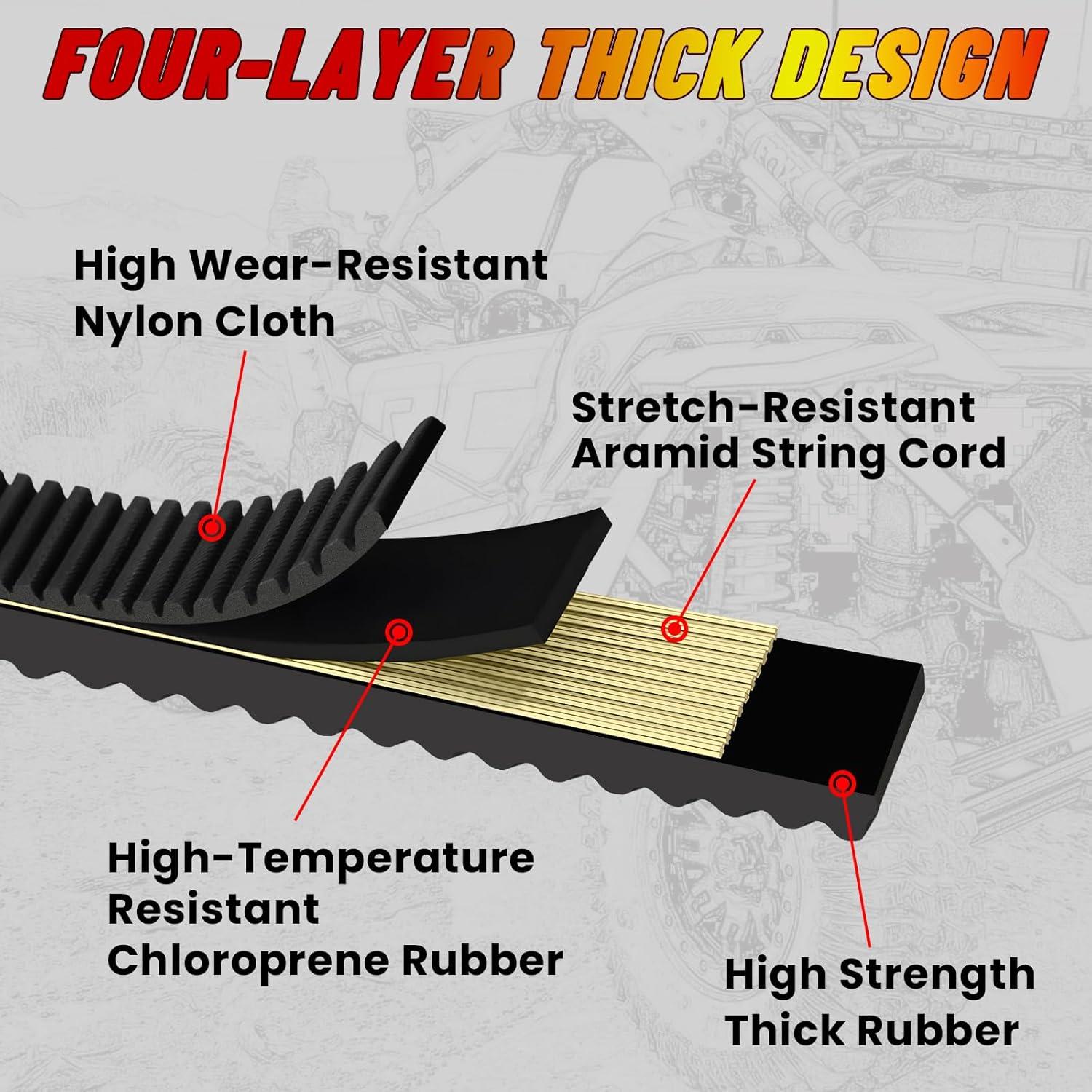 FOUR-LAYER THICK DESIGN: The rzr drive belt was wrapped with high durable nylon fabric on both tooth surfaces, which makes less noise and improves transmission efficiency; Mid layer is high strength chloroprene rubber; Aramid string cord plus another layer of rubber will prevent rapid breakage of the belt