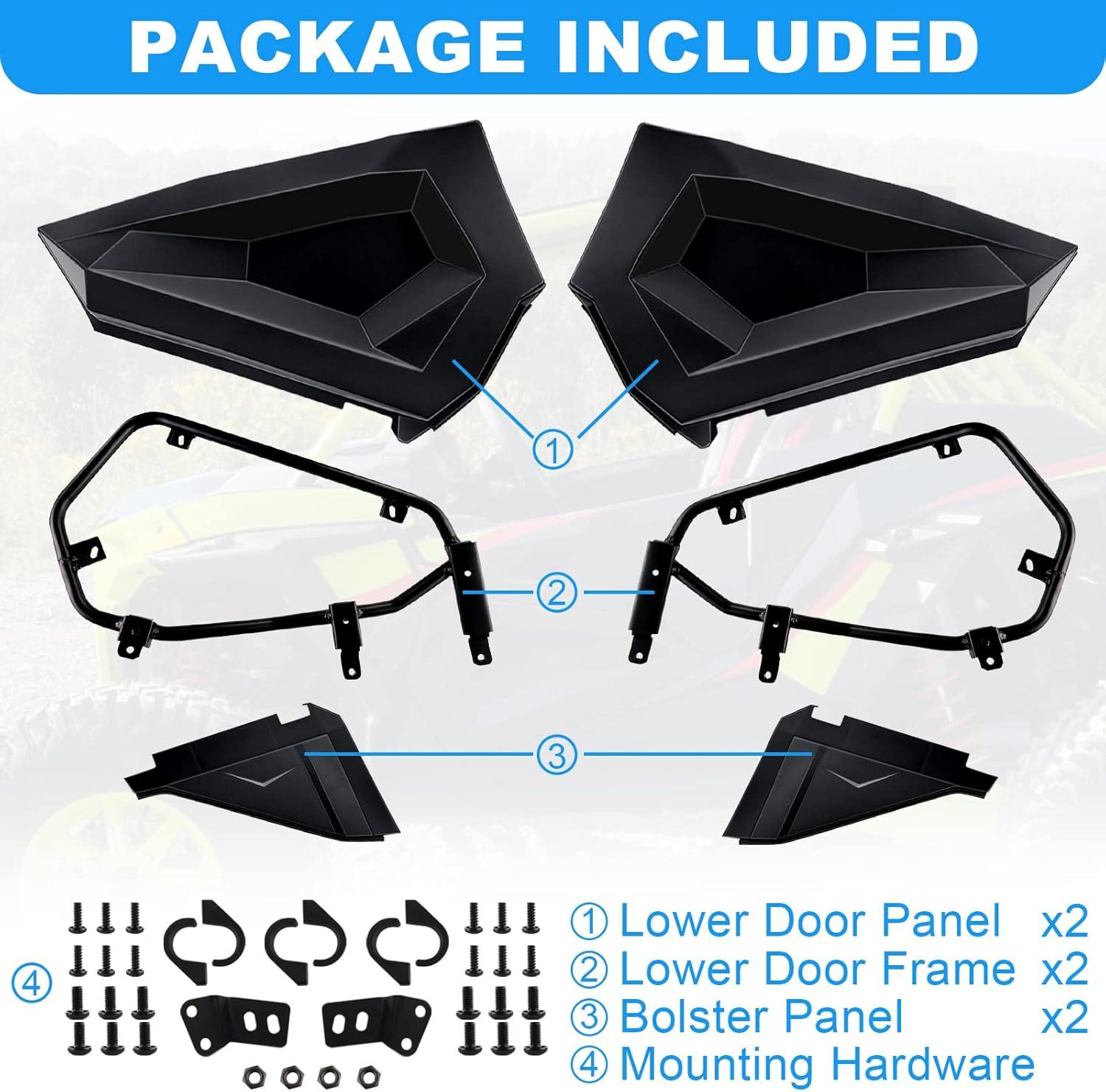 WHAT YOU GET: RZR 2 door set includes 2 front lower door panels with metal frame, 2 rear small triangles pieces near the bed, mounting hardware and instruction