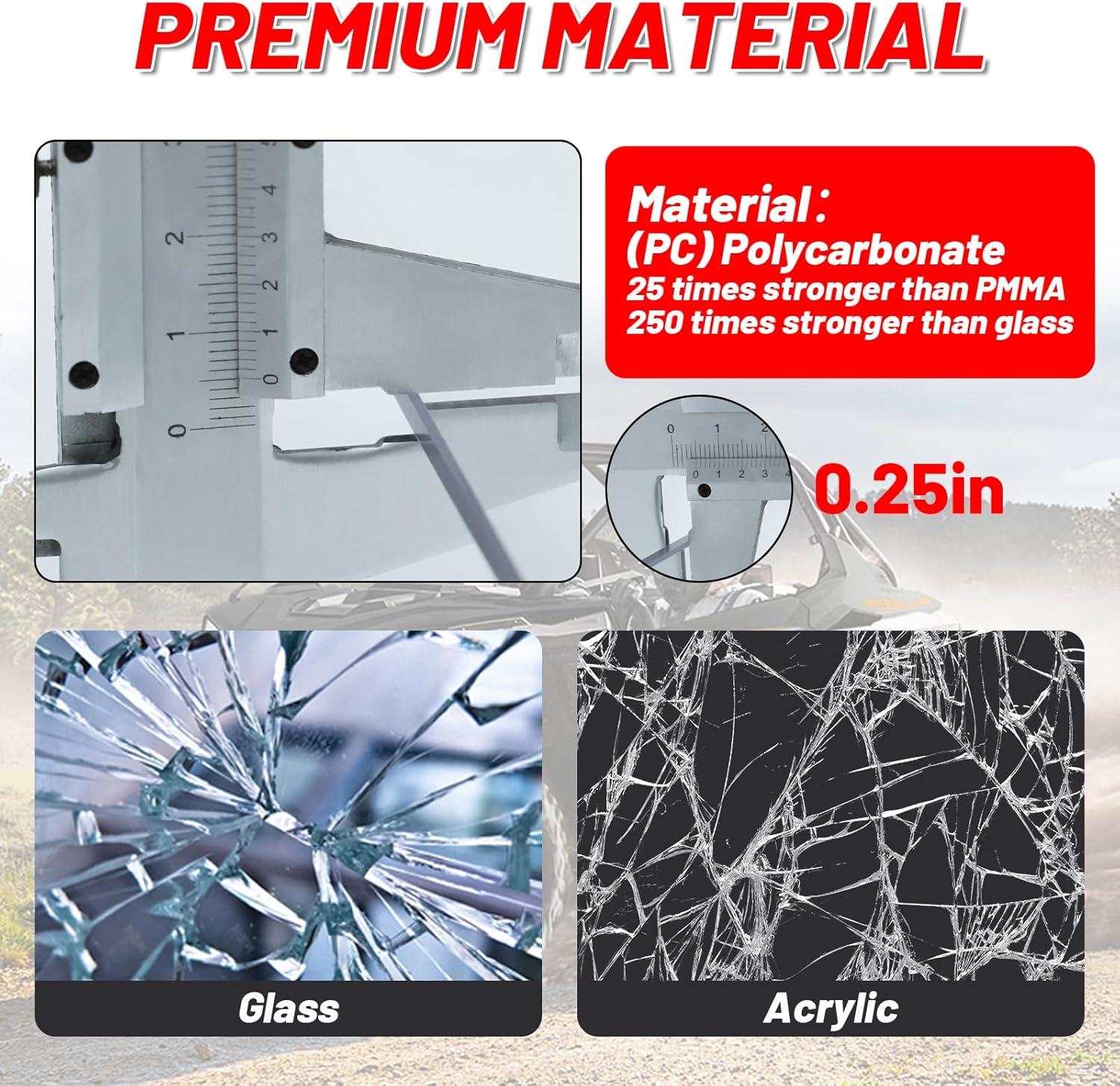 Durable Material: The rzr windshield is made of upgraded hard coated polycarbonate which is 25 times stronger than PMMA, 250 times stronger than glass, features scratch-resistant, shatterproof, shockproof, sunproof