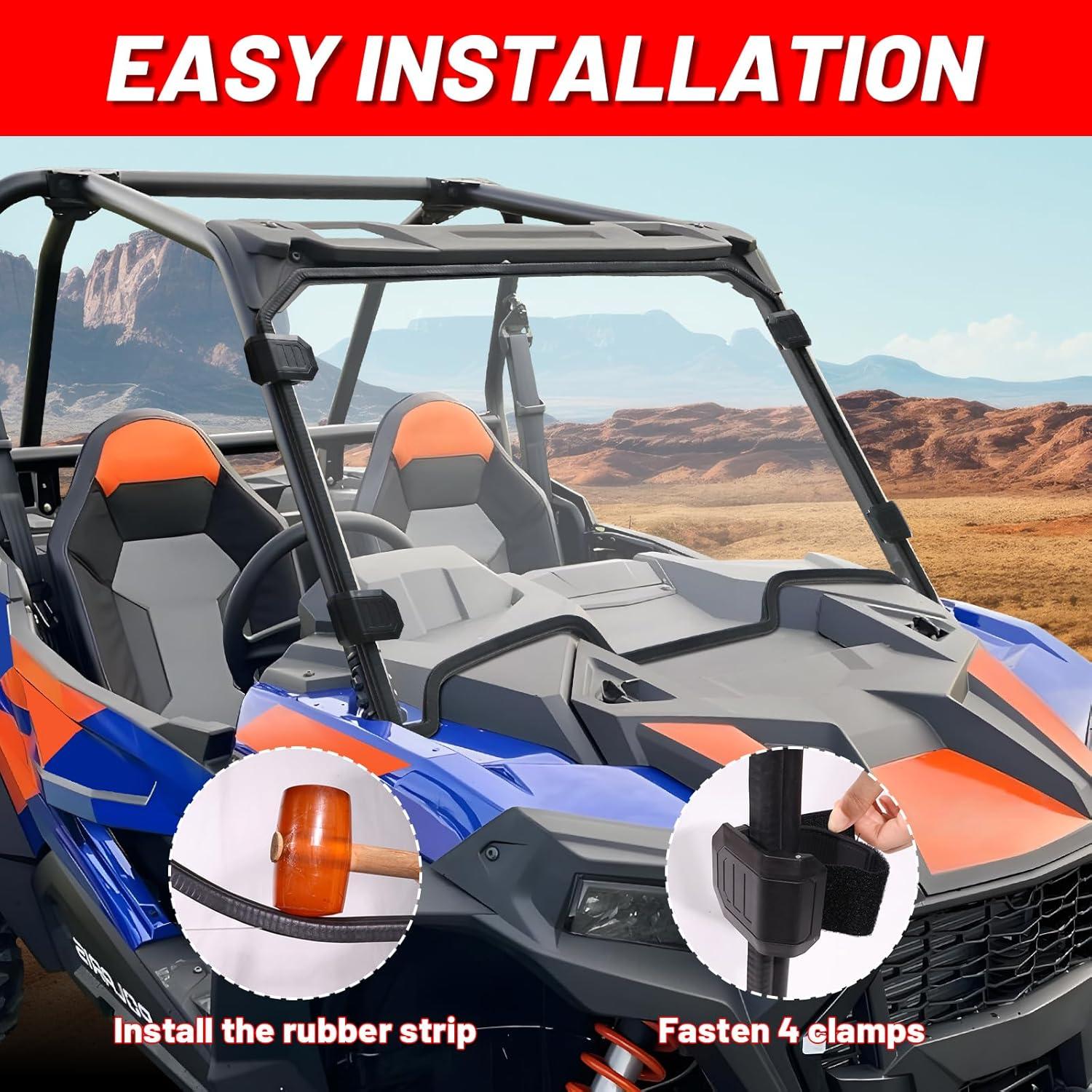 Easy Installation: It just takes few minutes to connect the roll cage and windshield together via quick-release sturdy clamps. Please be patient to install the waterproof seals. If any questions about installing, please refer to the attached instruction manual.