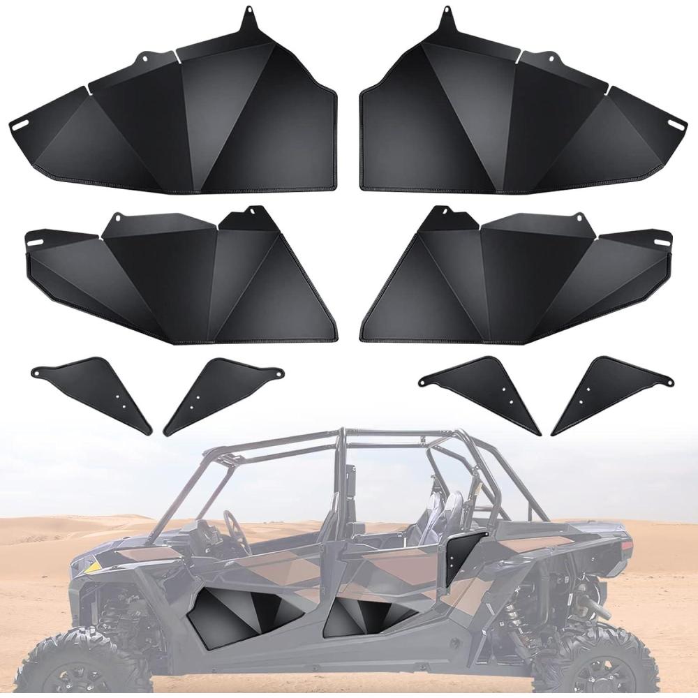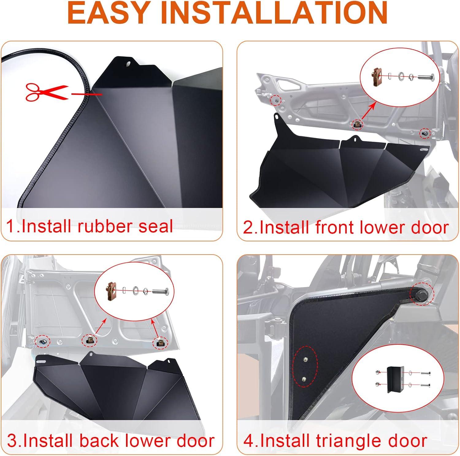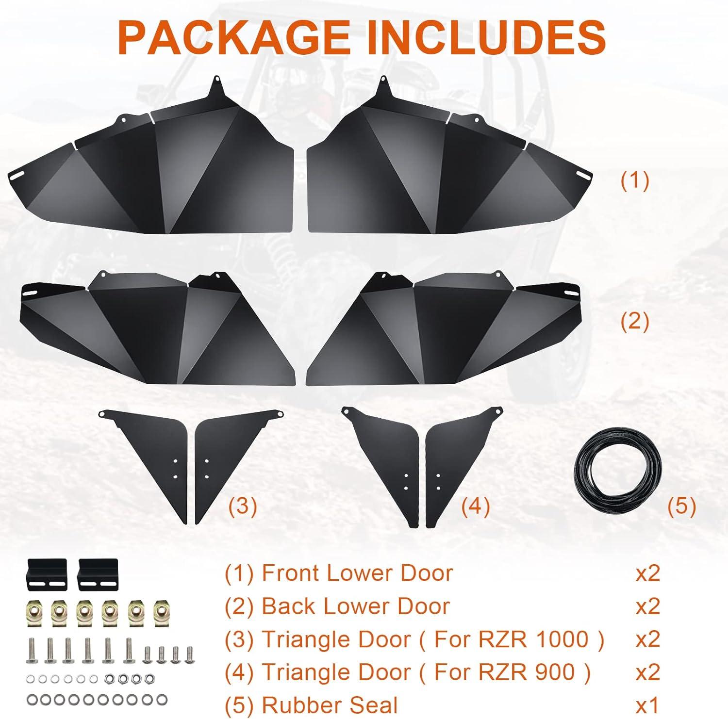 EASY INSTALLATION: The mounting hole was pre-drilled,just need install rubber seal and tighten screws; The package has-2 front lower door panels, 2 rear lower door panels, 2 pcs rzr 900 and 2 pcs rzr 1000 rear small triangles pieces near the bed, and a set of mounting hardware; And it will come with instruction