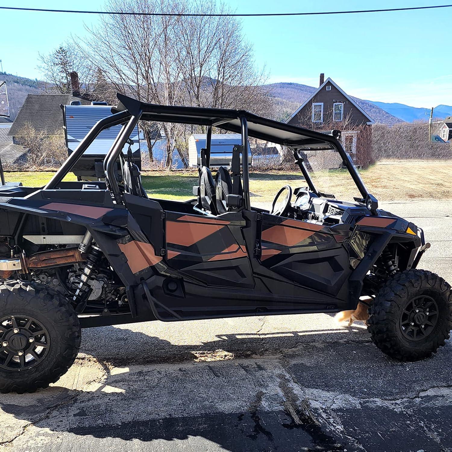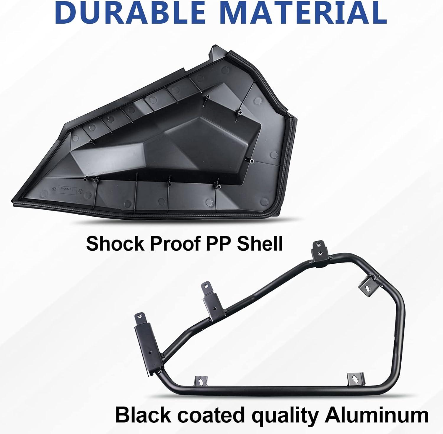 DURABLE MATERIAL: The RZR 4 door panels are made of high-quality PP plastic, and will not be easily damaged; Also it has a black-coated aluminum frame so that the whole door frame is more stable