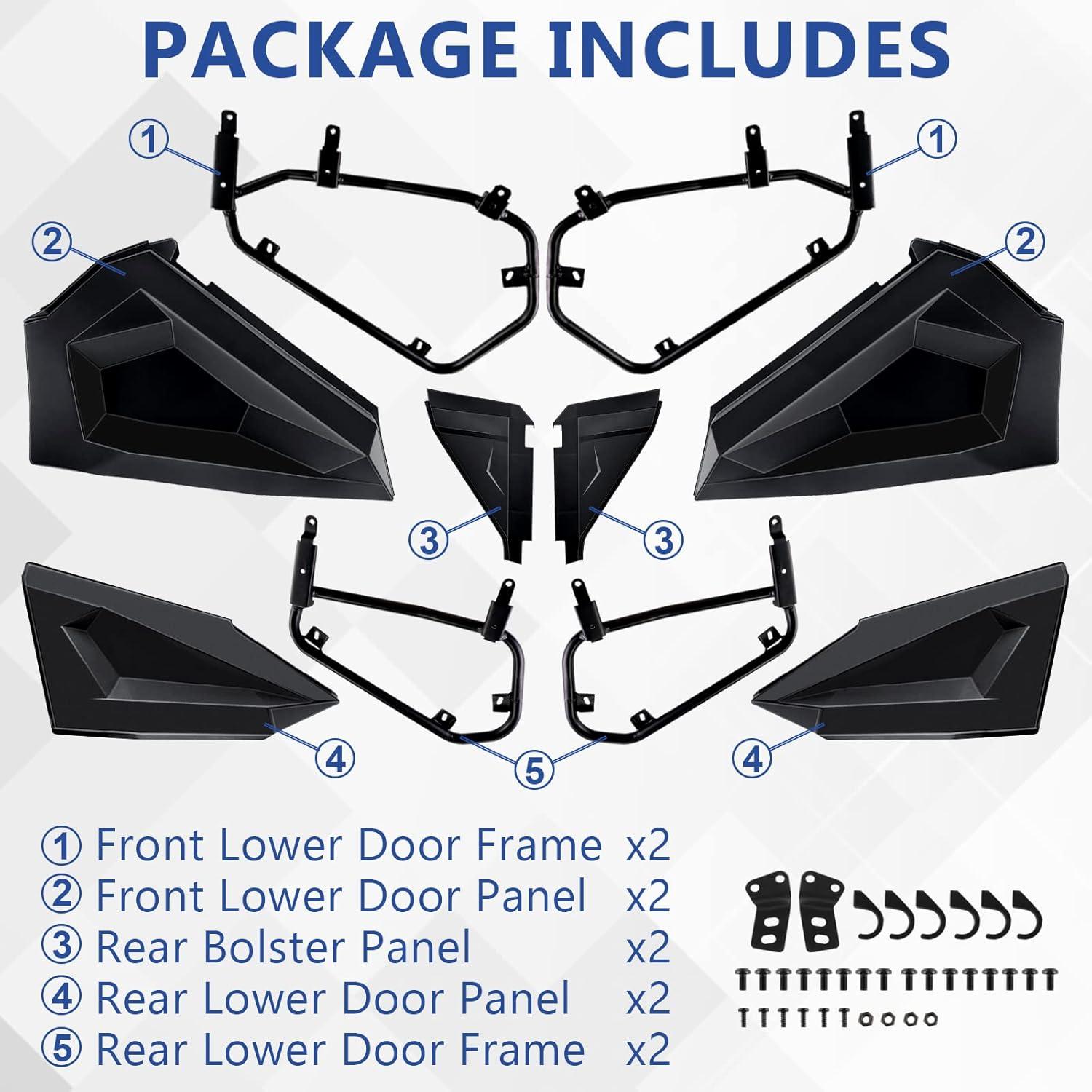 Package Included: The rzr door insert has 2 front lower door panels with metal frame, 2 rear lower door panels with metal frame, 2 rear small triangles pieces near bed, and a set of mount hardware
