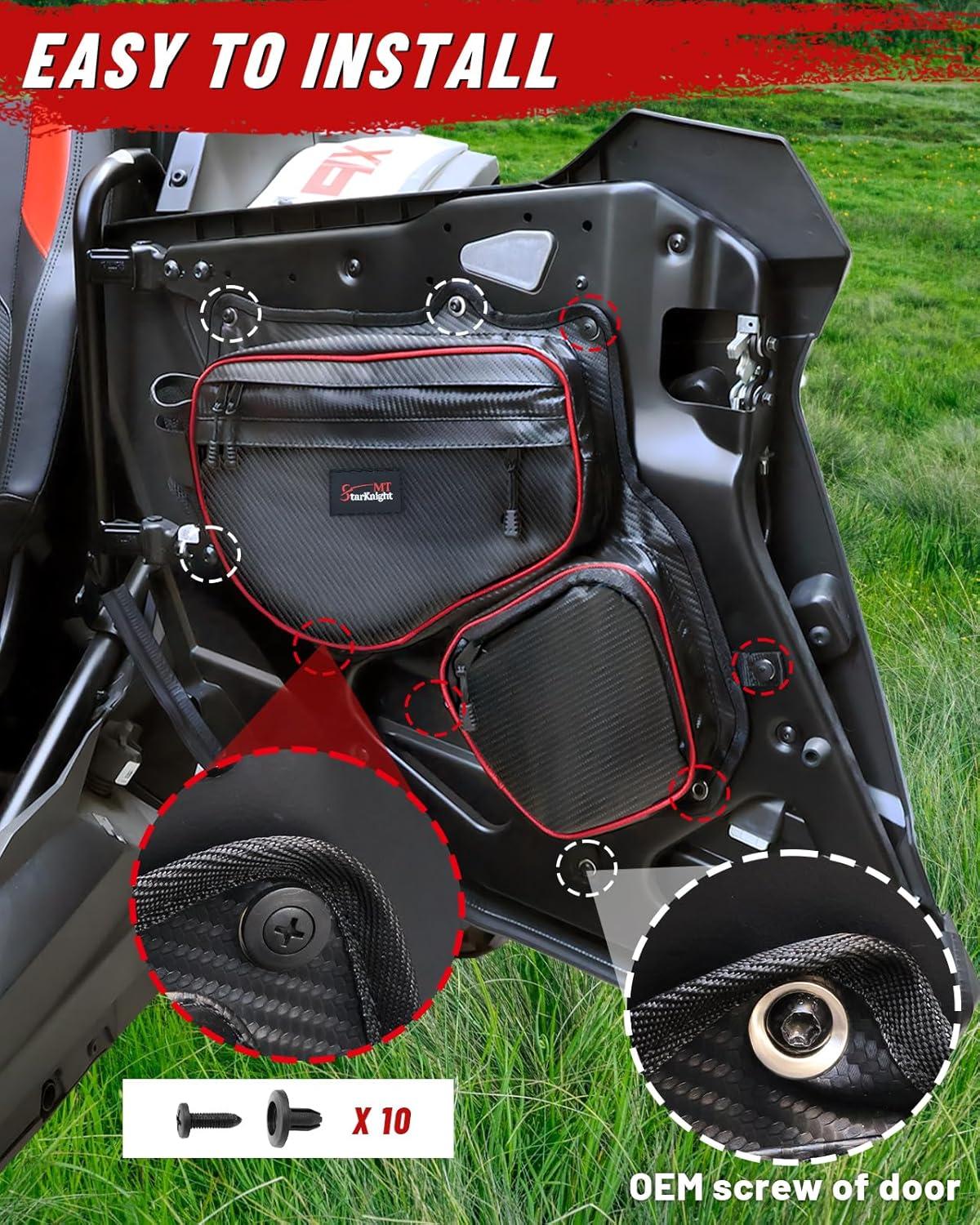 Easy To Install: No need to drill holes, just remove the OEM screws on the car, install the door bag with OEM screws, and then fix it with push rivets. There is no problem with wild driving. Even if your rzr is running up and down in complex terrain, secure and sturdy. Tips: It is best to remove the detachable bag during installation