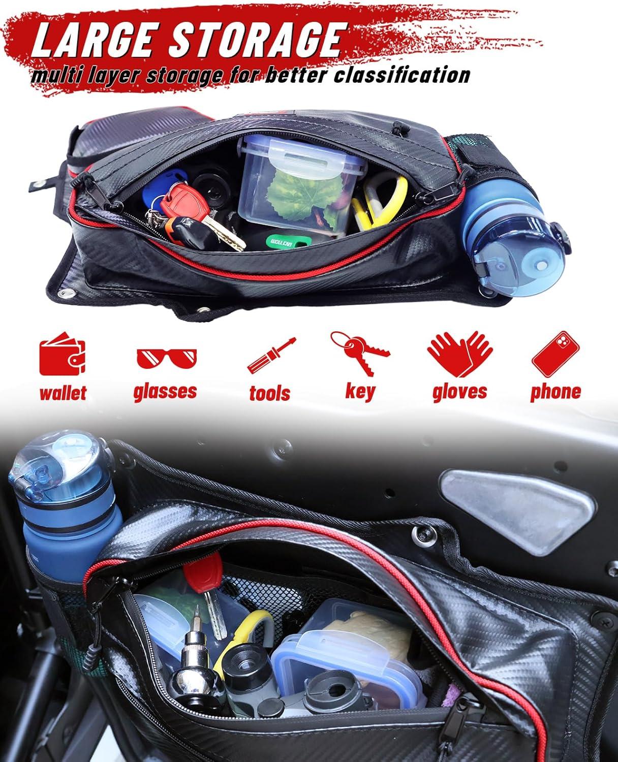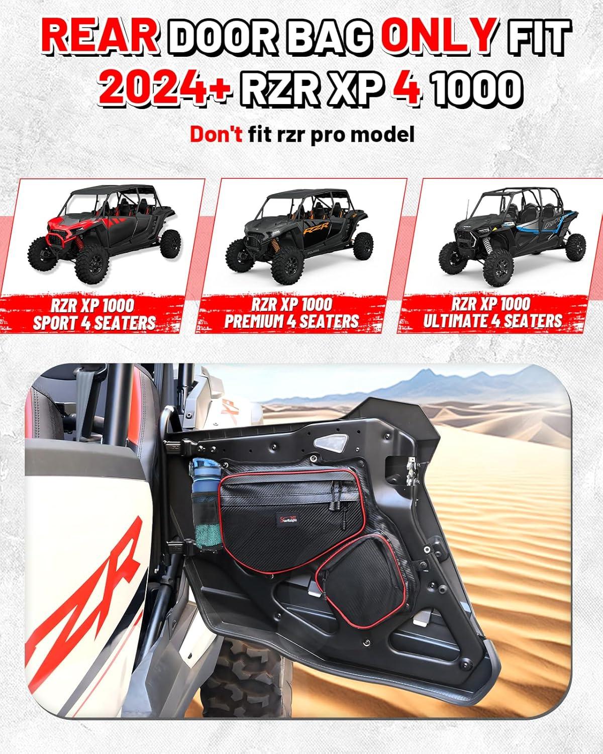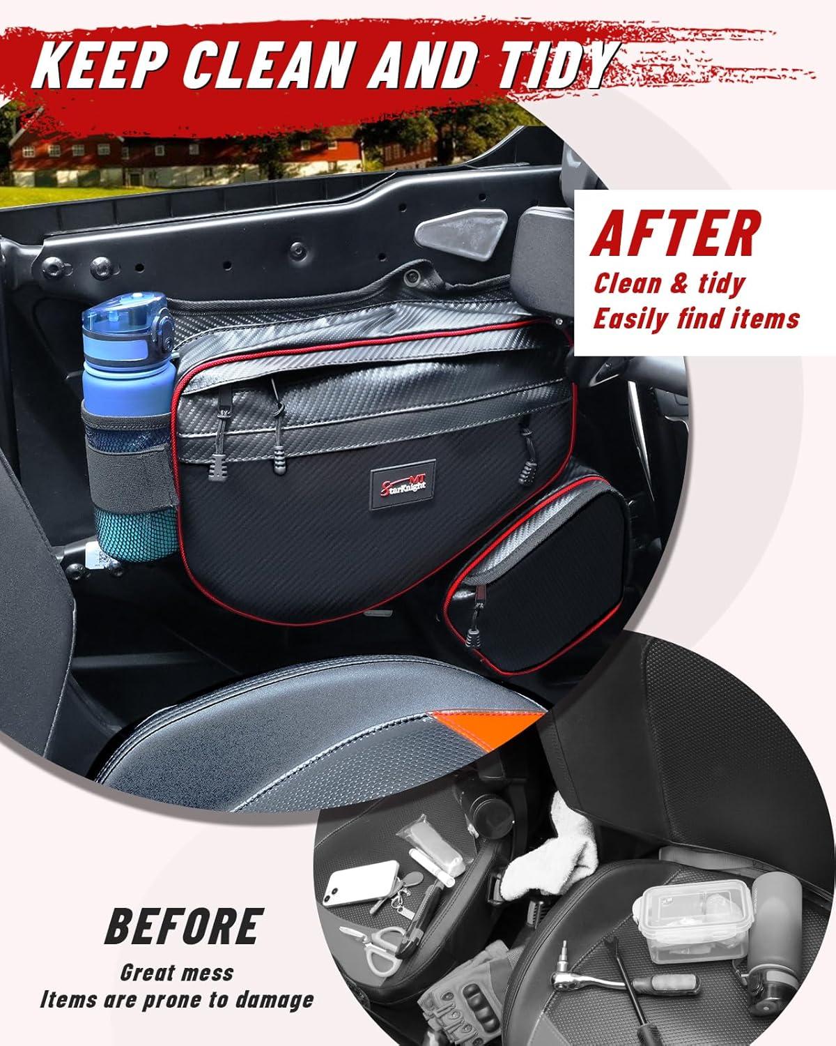 Special Design: The rzr xp 4 bag is designed a water cup pocket for convenient placement of water cups for rear passengers. The design of combining large and small bags reduces the separation of bags and increases the space inside the bag. Installed in the limited space of a car door, it offers superior space utilization compared to 3 bag