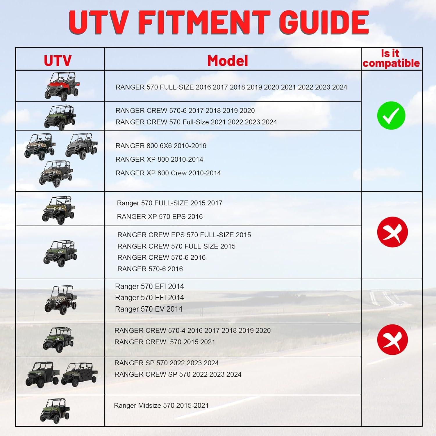 Fits Ranger 800 570: The ranger windshield is compatible with Polaris Ranger 800 XP 2010-2014, Ranger 800 CREW 2010-2014, and Ranger 800 6×6 2010-2016, Ranger full size 570 2016-2025 with round tube cage, 2017-2022 Ranger 570-6 Full-Size (Round Tube Cage) , 2023-2025 Ranger Crew 570 Full-Size (Round Tube Cage)