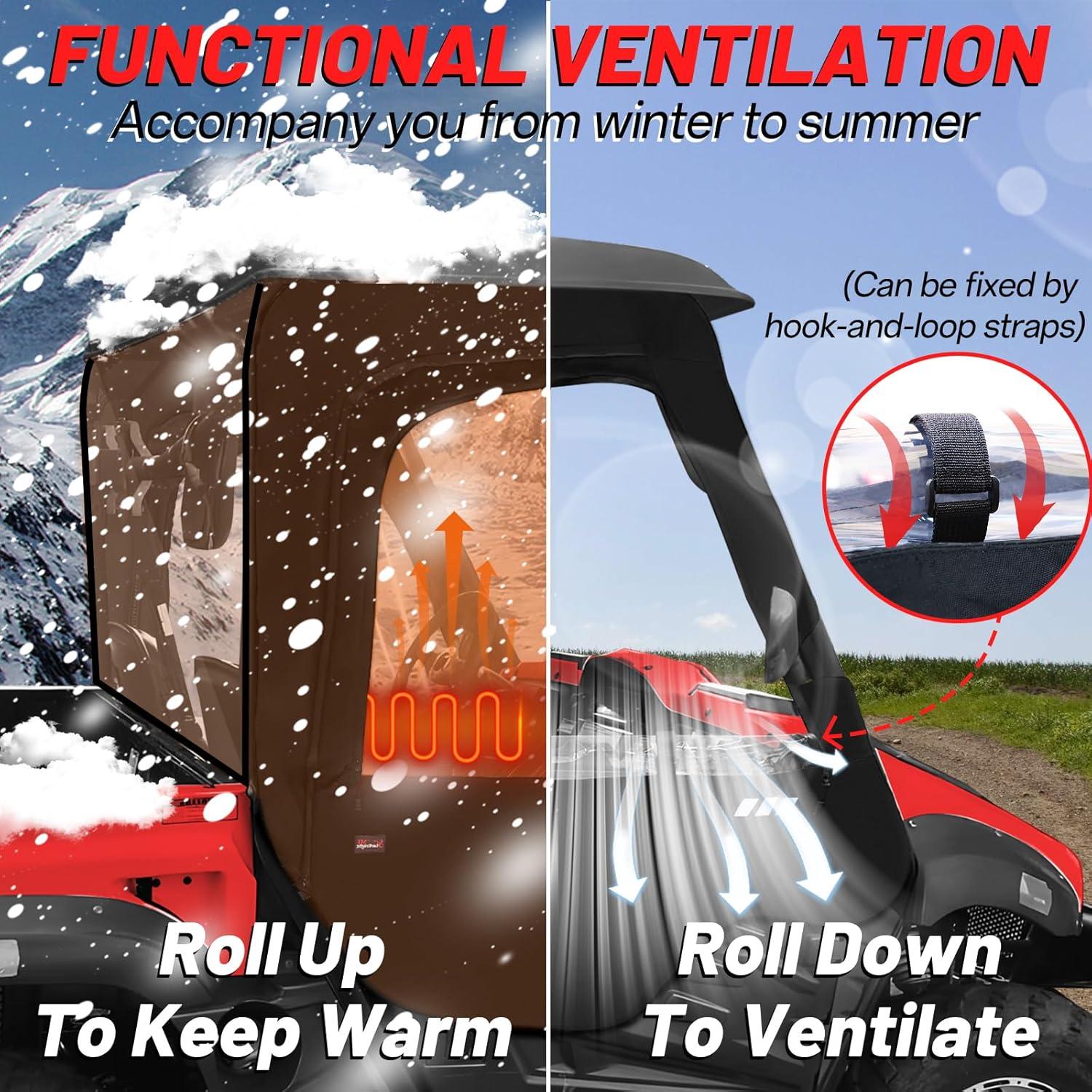 【Transparent Roll Blind Design】The soft upper windows are designed for functional usages. In daily driving, especially on windy days or cold days, you can roll it down to prevent debris from getting in your cab suddenly and keep warm. In hot day,you could roll up it and get the cool wind