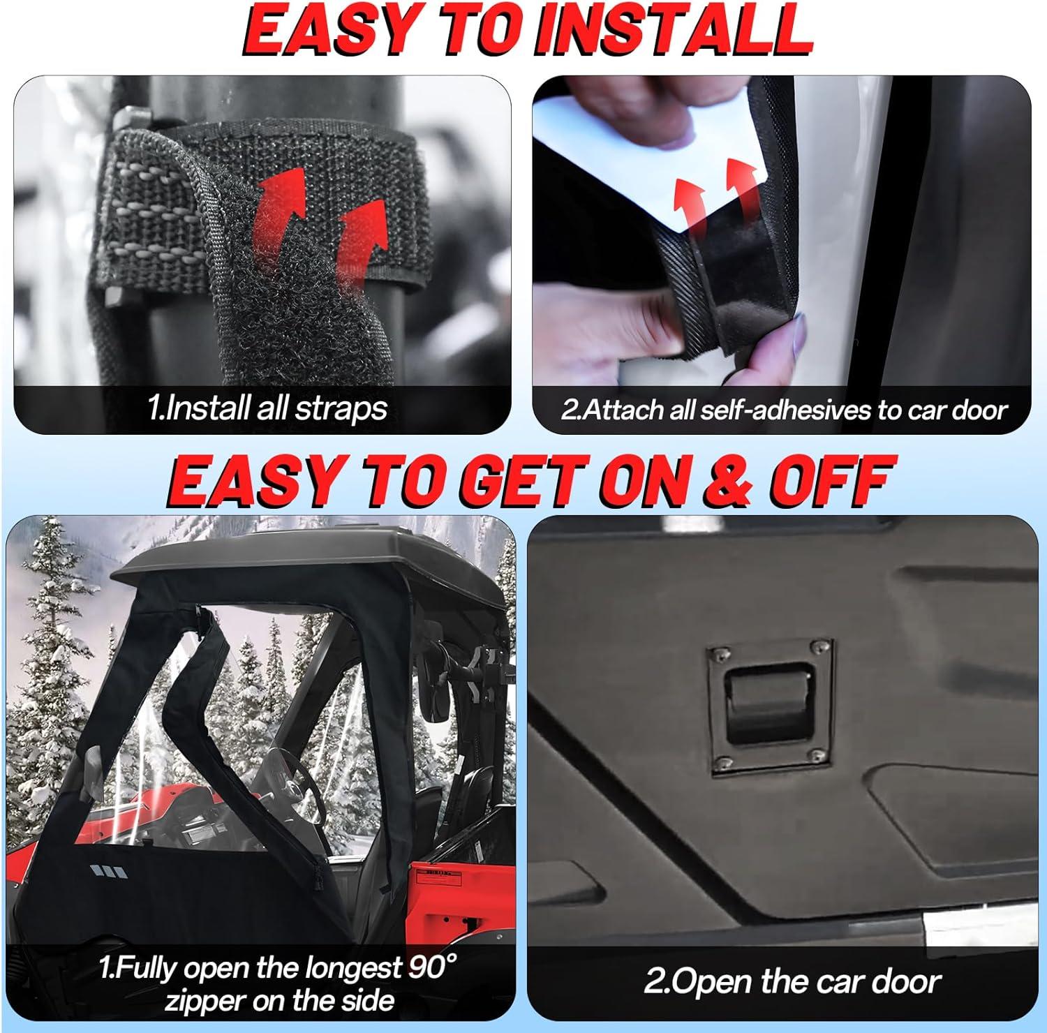 【Use With Windshield & Roofs & Door】The soft upper doors are installed with strong sticky strips to fix on door, convenient for getting in and out of the car, just pull the door zipper,open the door. The UTV upgrade upper soft door most fit for most windshields, roofs, car door.