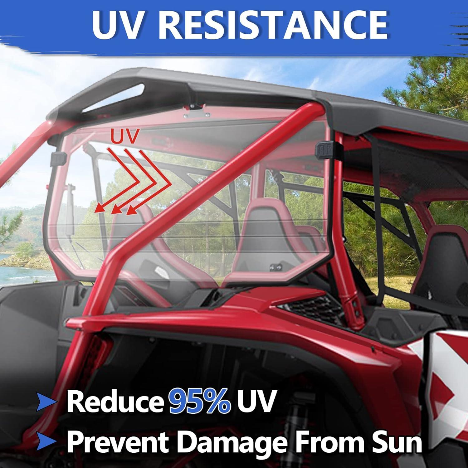 UV Resistance: The Talon 1000 back windshield features no-frame and UV-resistant. It reduces uv radiation to the driver and cab from sunlight, protecting the driver cab from aging, so the vehicle inner parts won't turn yellow for a long term