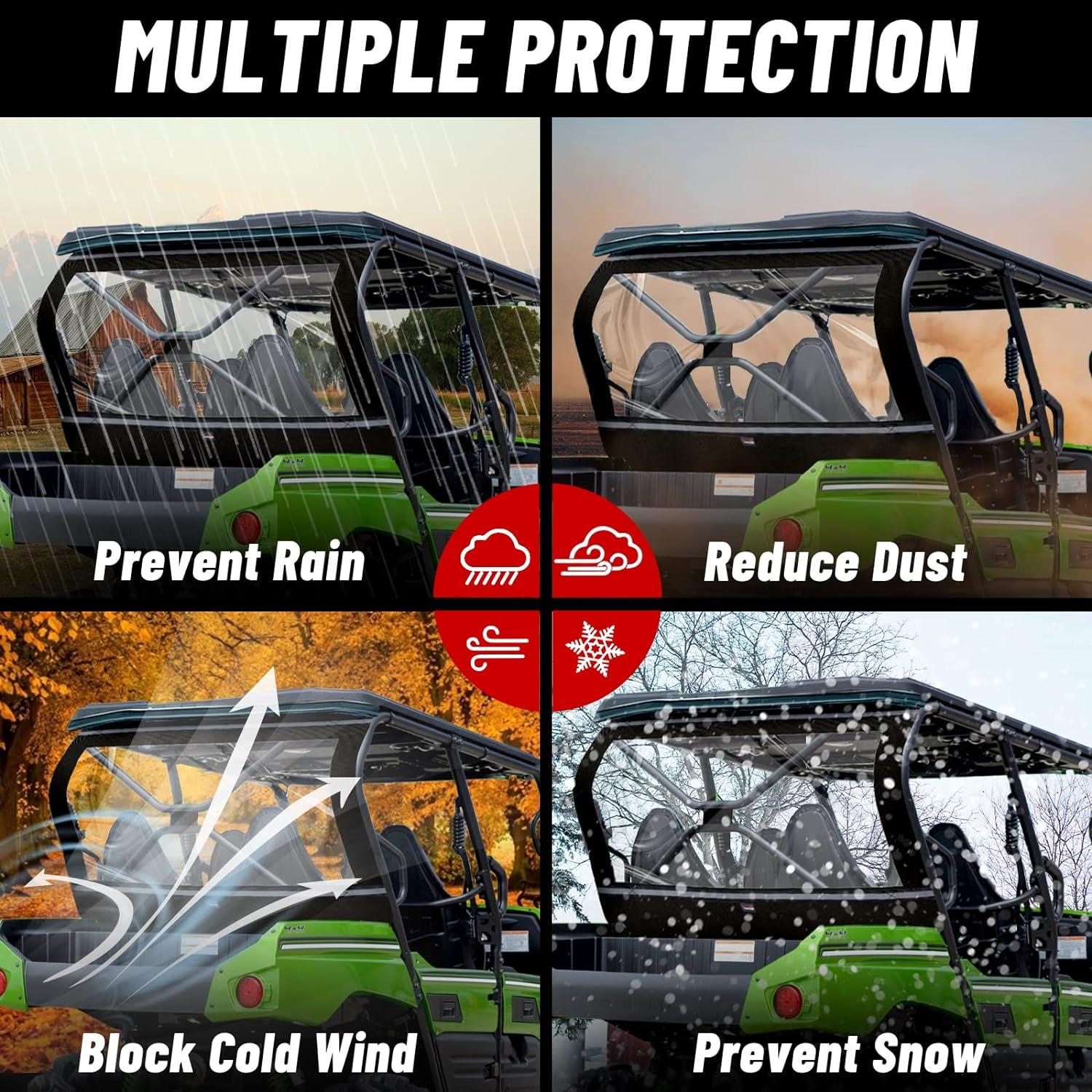 Heavy-duty Material: The TERYX rear windshield is made of durable oxford fabric with waterproof coating, and thickened PVC mid-transparent panel can avoid cracks or tear in high wind. Besides, the UV coating surface will protect the front seat and dust panel from fading under the sun radiation