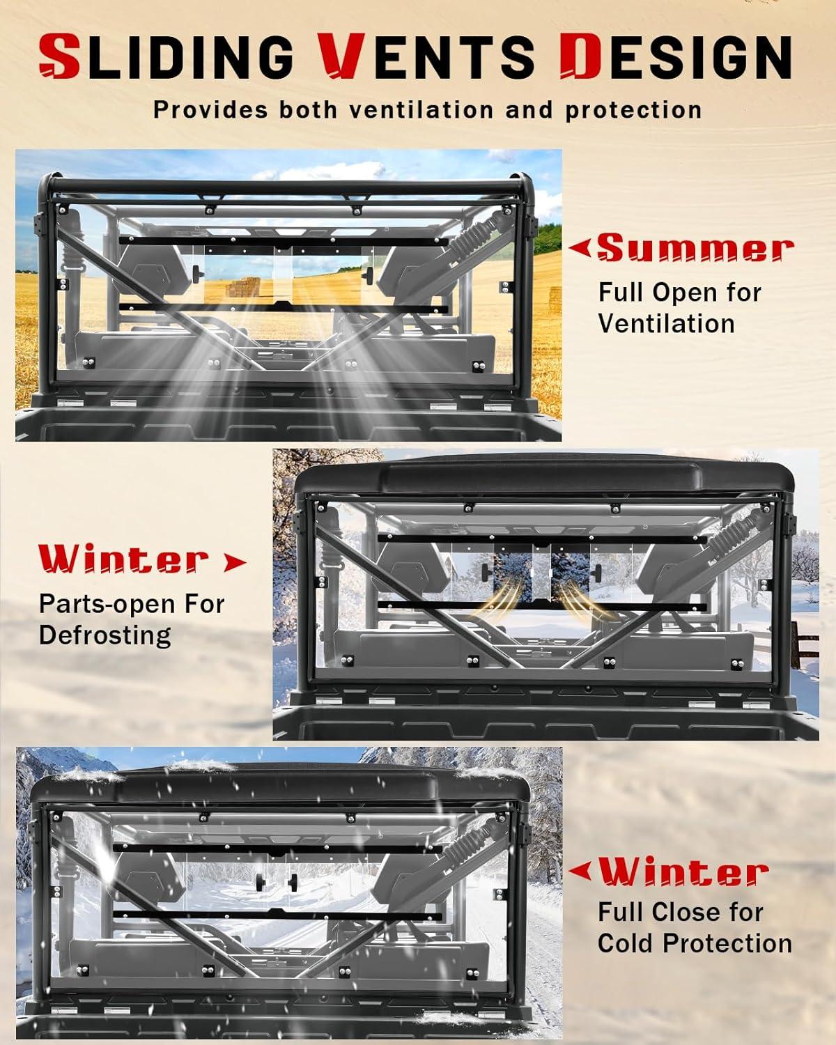 Sliding Vents Design: The rear window features a 2-in-1 design that combines the advantages of a full rear windshield and a vented rear windshield. Simply slide the handle to switch modes: Open vents to get fresh airflow in summer; Close for cold wind protection or part-opens for defrosting in winter
