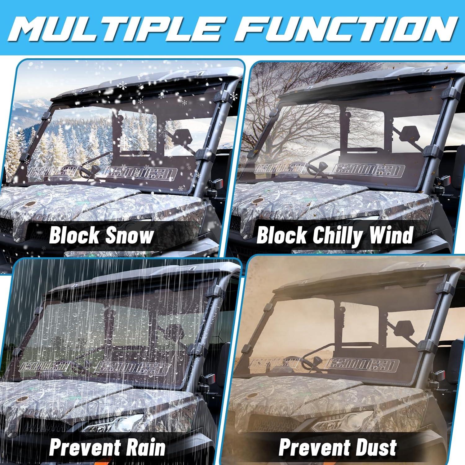 2 in 1 Full Windshield: You can close the vents to defend against the chilly wind, flying snow, rain, and dust; Also you can open them to avoid stuffy and to defog. Combined with a full-length waterproof rubber seal, the windshield is rattle-free and of great waterproof