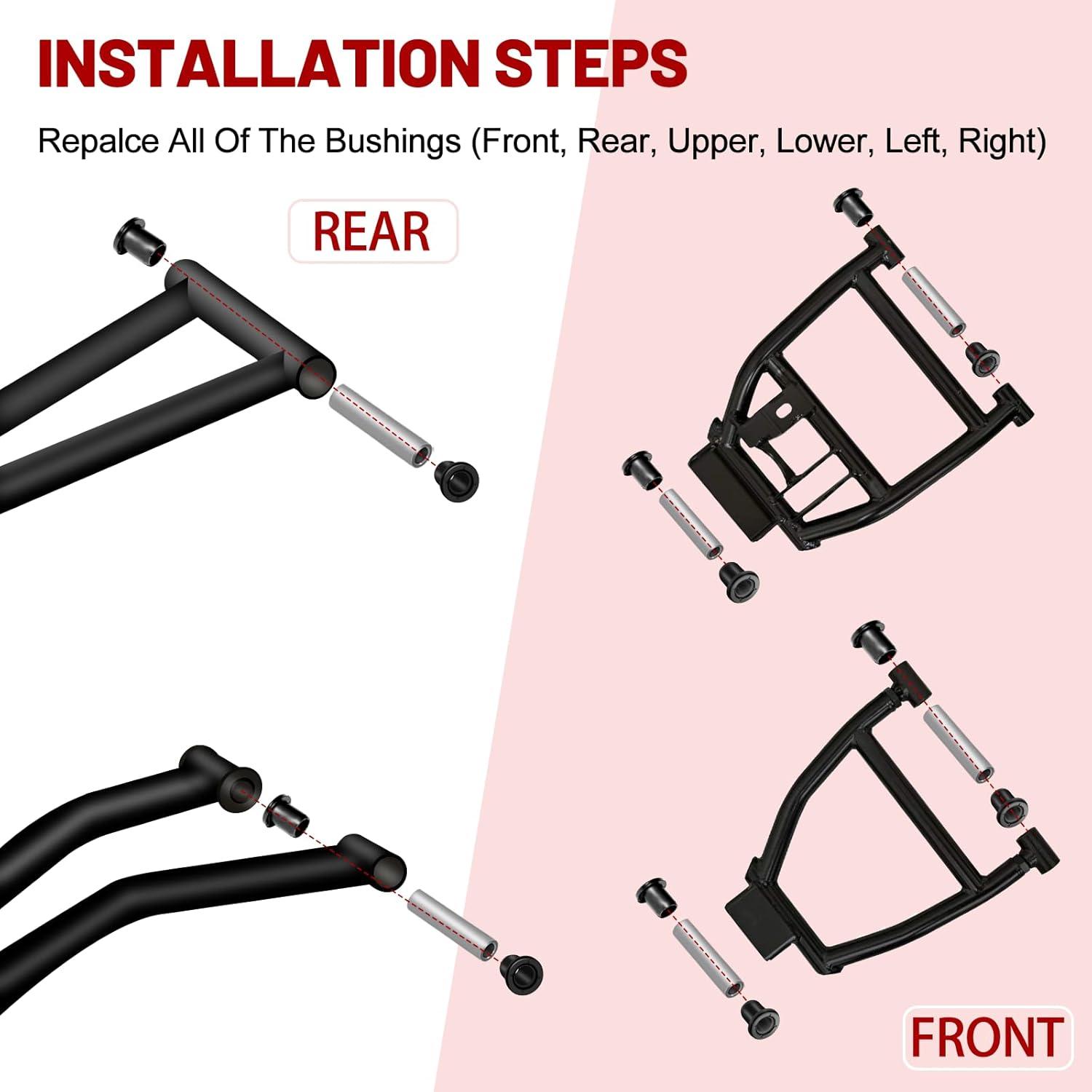 PACKAGE INCLUDE: The ranger xp 900 a arm bushing kit comes with 36pcs bushings,18pcs sleeves with 4 different lengths, and 1 installation instruction