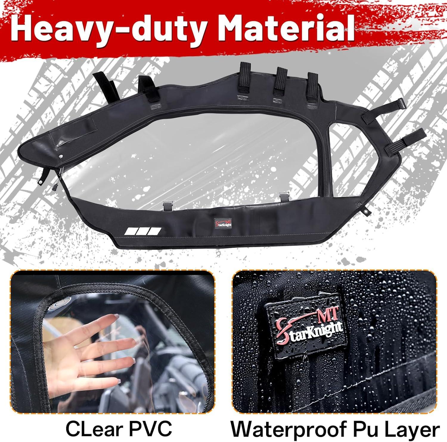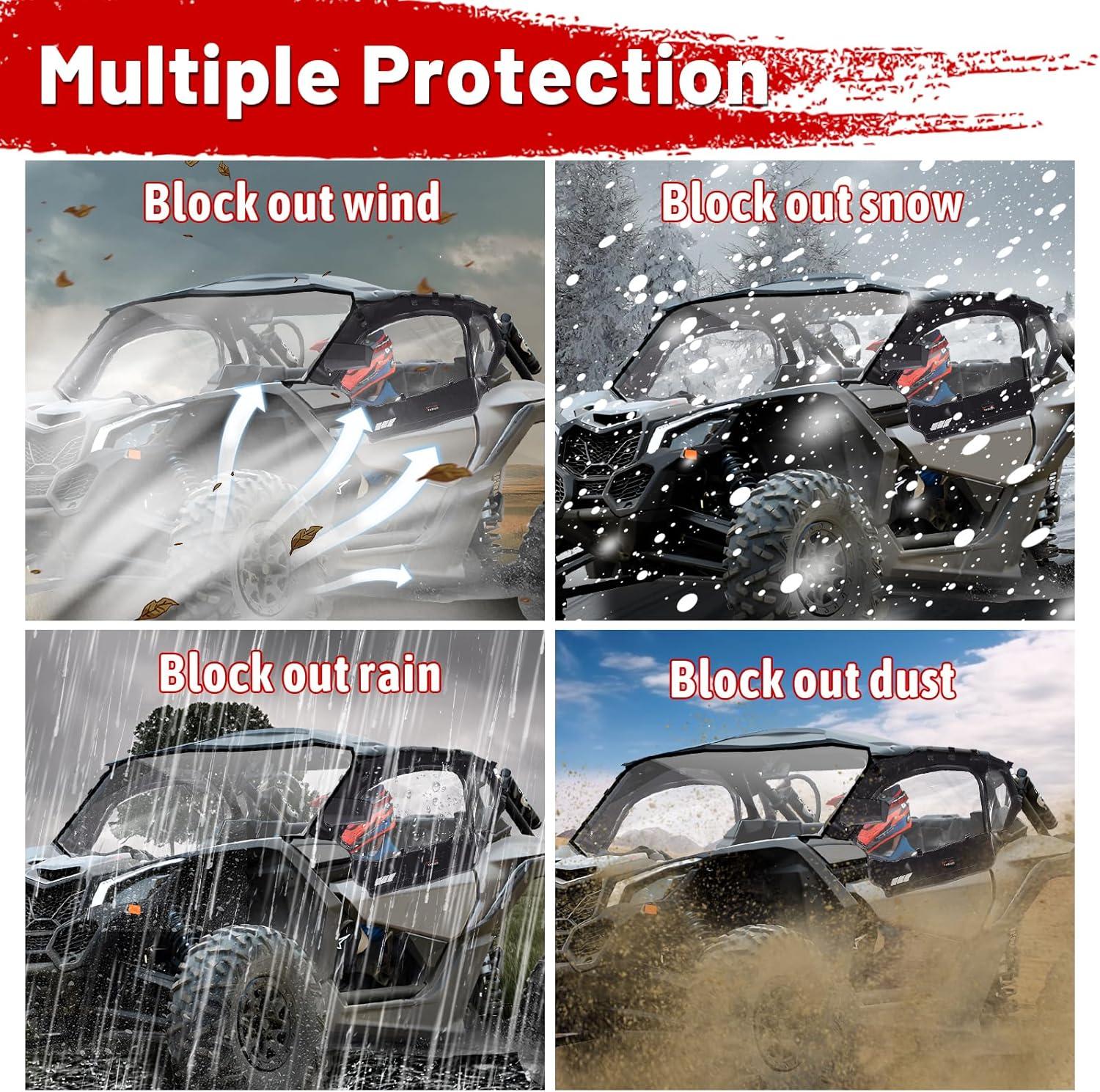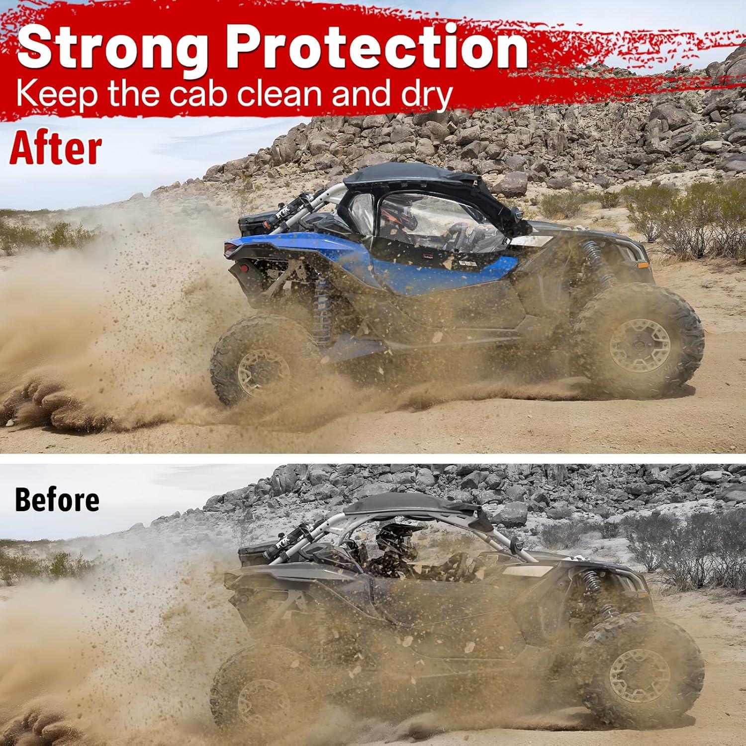 【All-round Protection】The X3 cab enclosure is made of waterproof PVC mesh cloth and PVC transparent film. This window fits the vehicle perfectly without leaving no gaps for wind or rain to enter the cab, it can effectively block out rain,snow,sewage,mud,sand,dust,leaves to keep the interior of the can am x3 dry and tidy