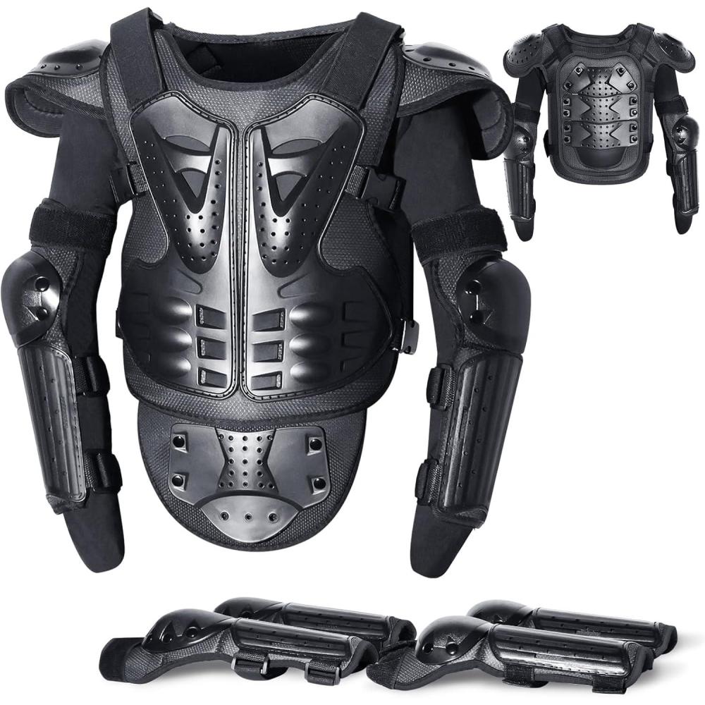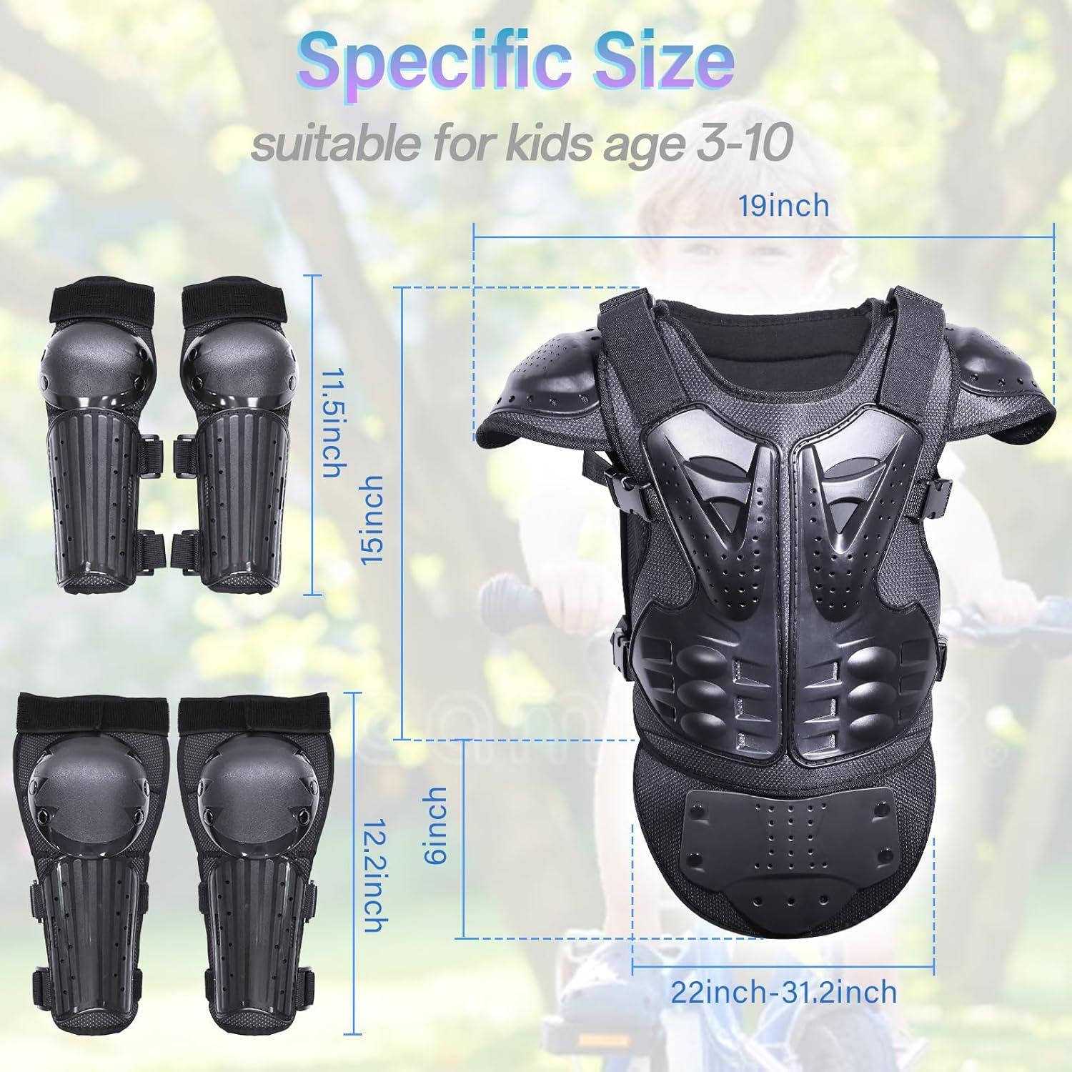 Easy to Dress: Uses elastic waist straps with adjustable release buckle,and the chest pad can be separated from back pads. The knee pads and elbow pads use high strength wear resistant materials and powerful hook and loop fastener. Flexible design, all-round protection for children