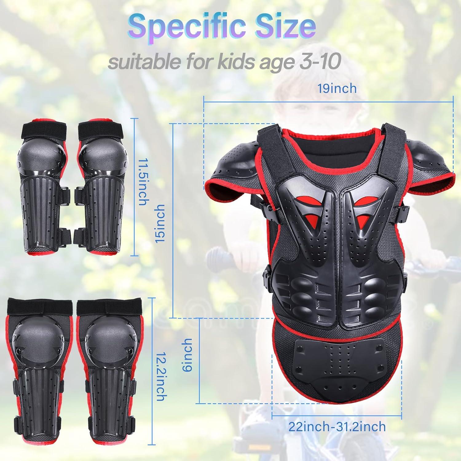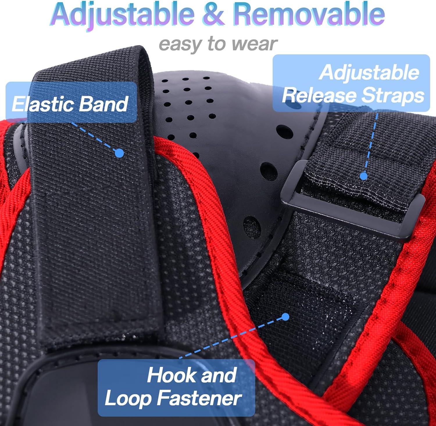 Easy to Dress: Uses elastic waist straps with adjustable release buckle,and the chest pad can be separated from back pads. The knee pads and elbow pads use high strength wear resistant materials and powerful hook and loop fastener. Flexible design, all-round protection for children