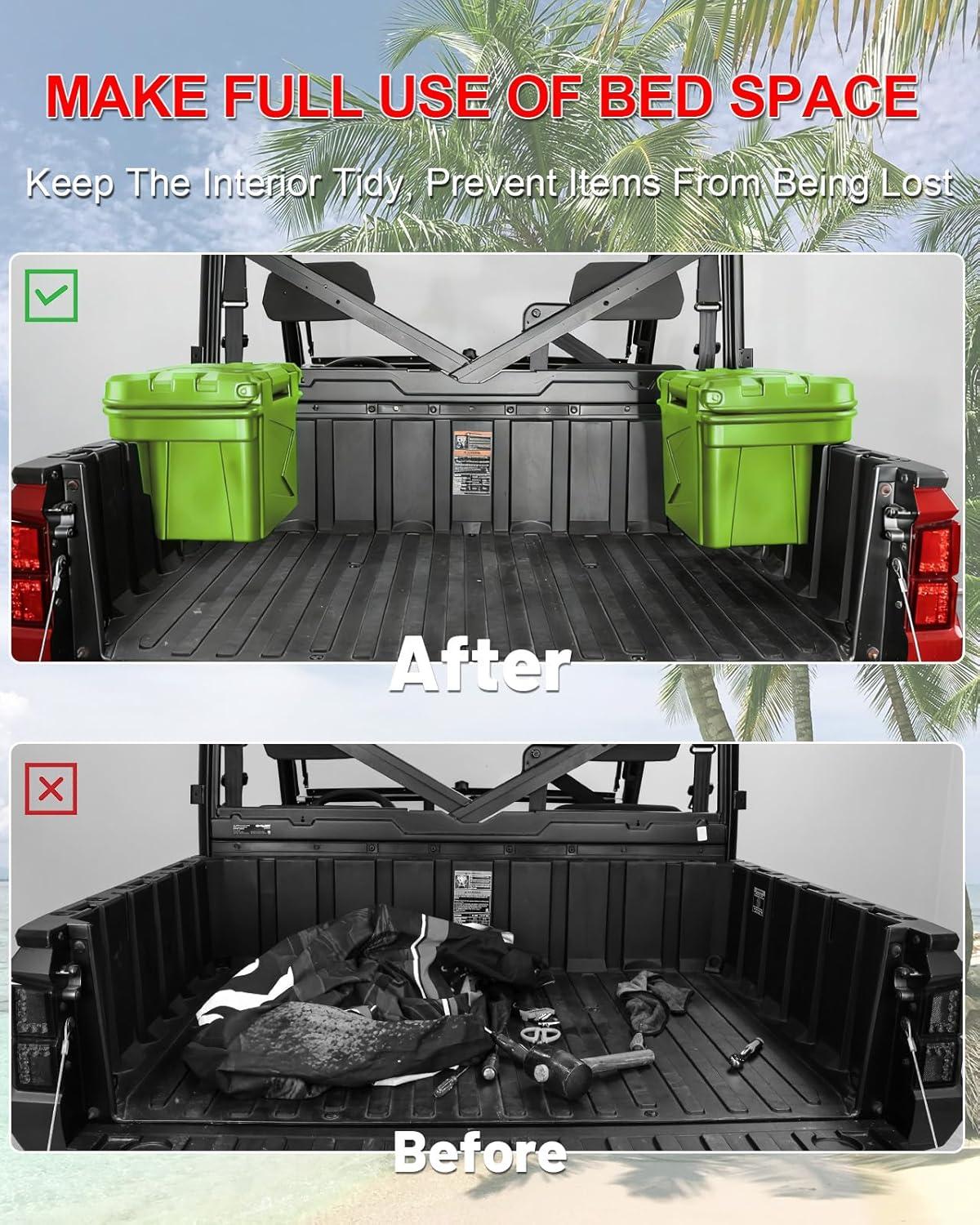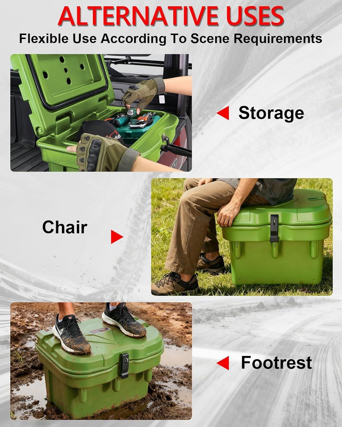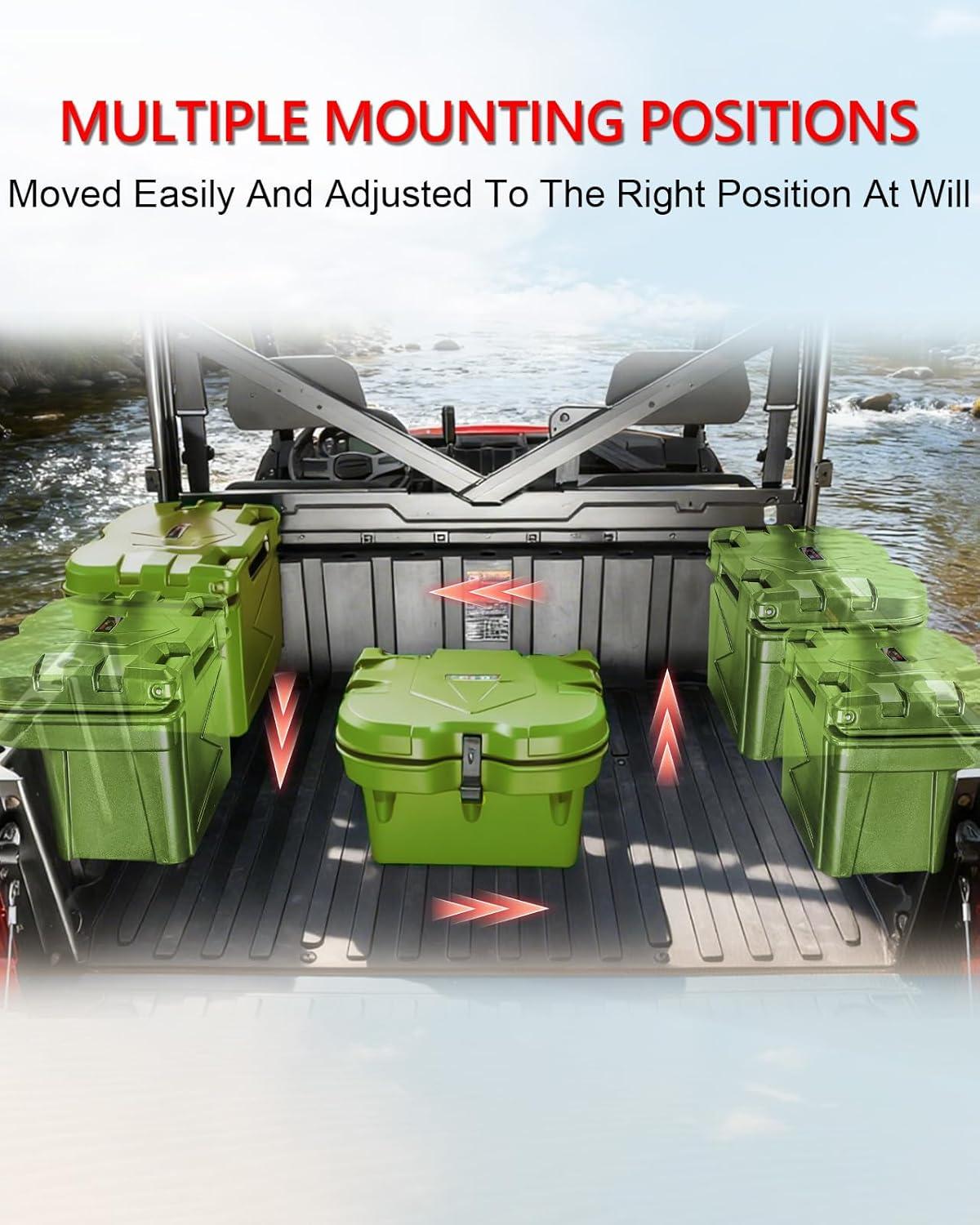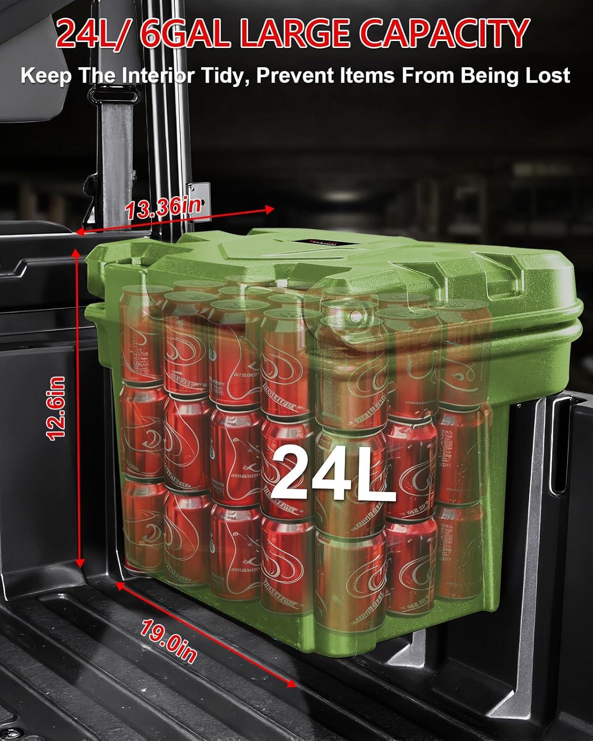Store and Organize Your Gear: The 6 GAL UTV bed box with a contoured design provides enough room for cargo storage, you can store food, off-road meals, drinks, energy bars, tools, and spare parts, safety and emergency needs, extra clothes, shoes, gloves, socks, gloves, towels, fishing, camping and hunting accessories and other important items, it keeps them securely in your cargo box will make sure they stay in perfect working order