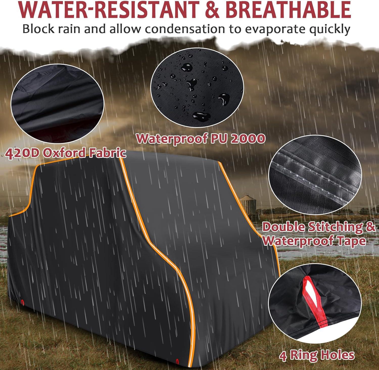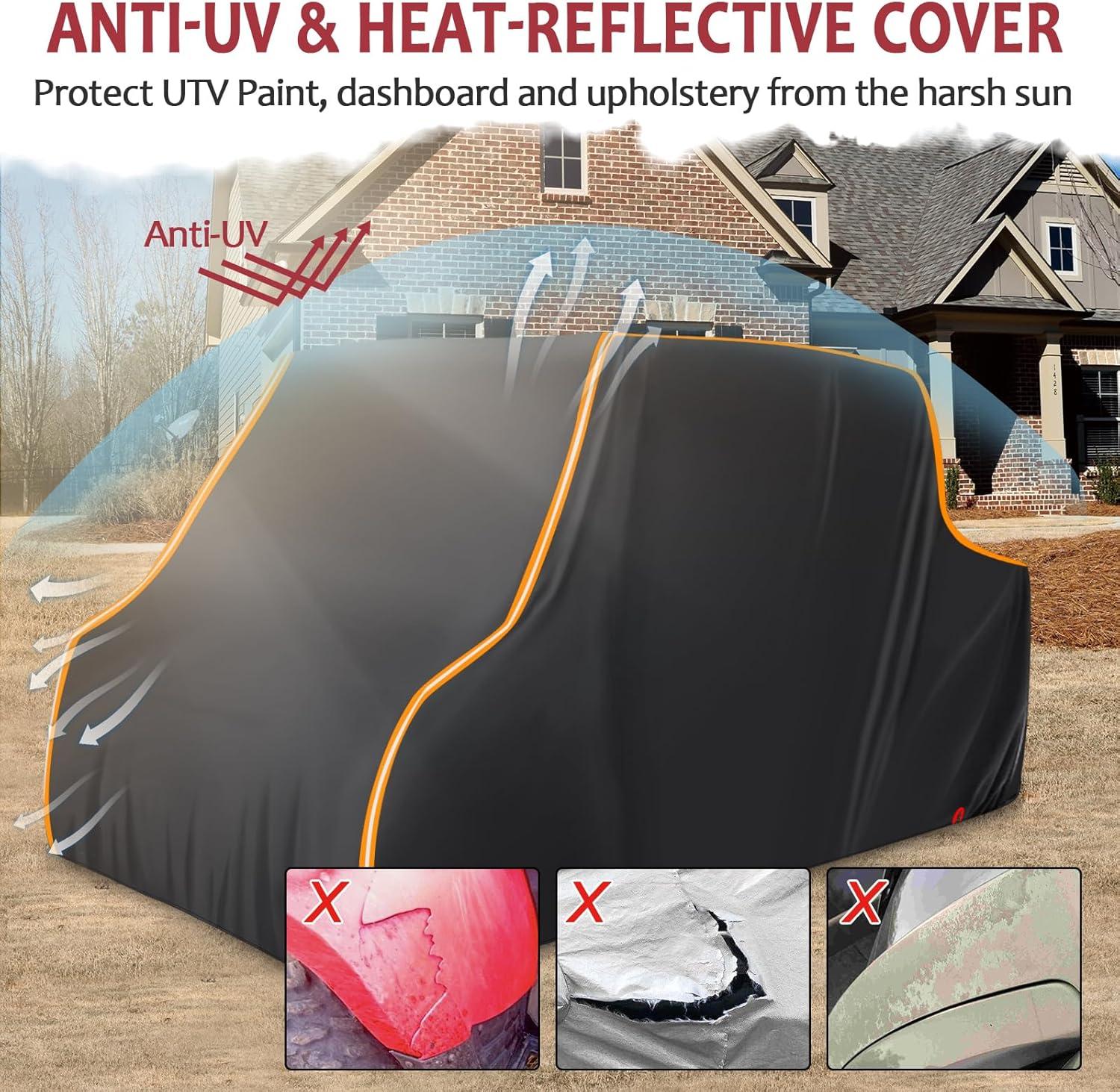 Waterproof Breathable Design: The UTV cover is made of 420D fabric with double stitched seams covered by waterproof tape, and the inner lining is coated with waterproof PU, ensuring a great waterproofing. Two ventilate vents with micro holes on both sides prevent trapping water condensation beneath the cover, effectively protecting your utv from dust, rain, fading, rust and paint damage