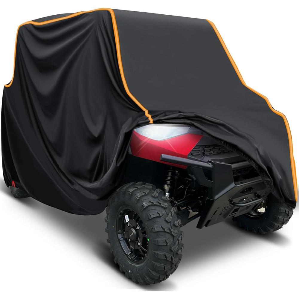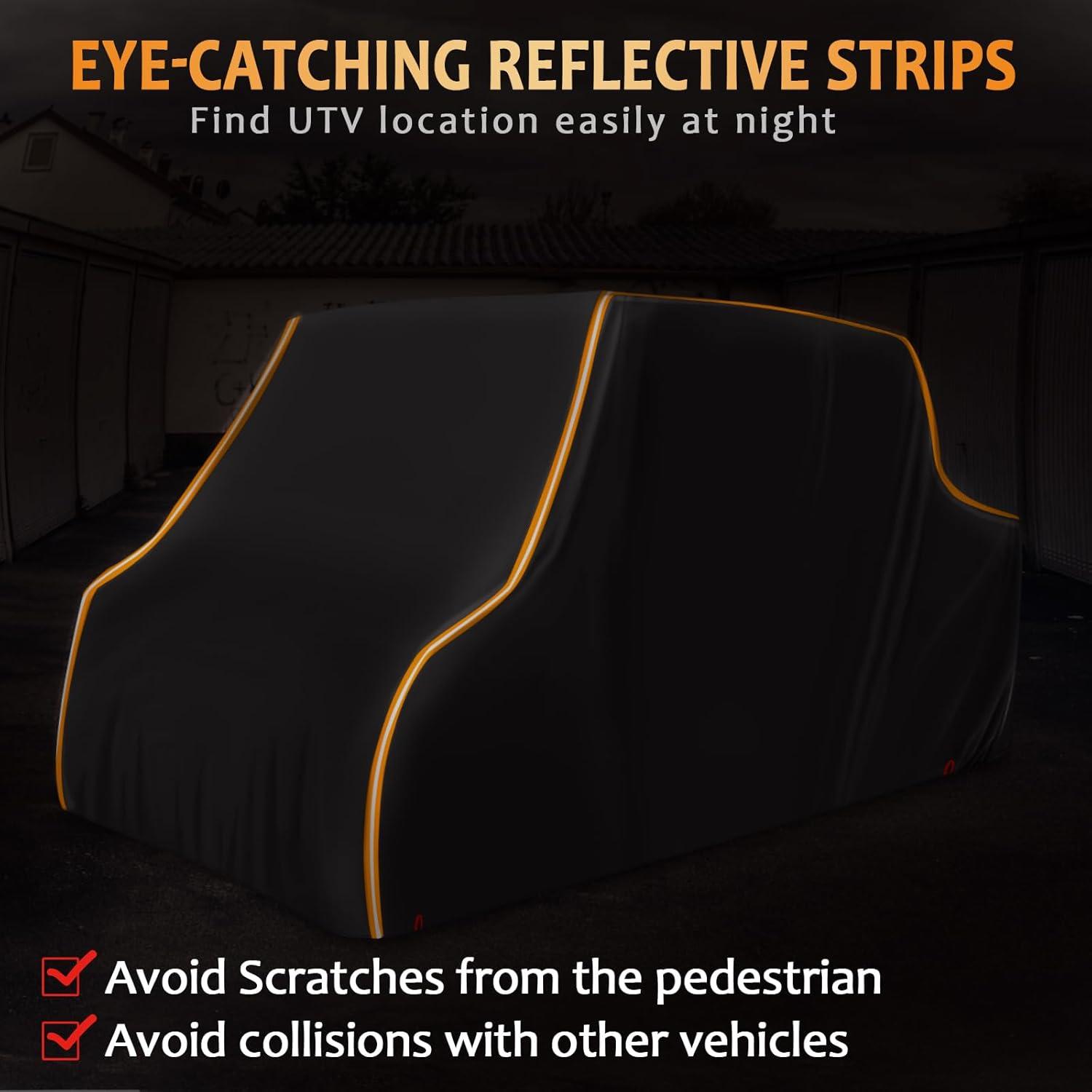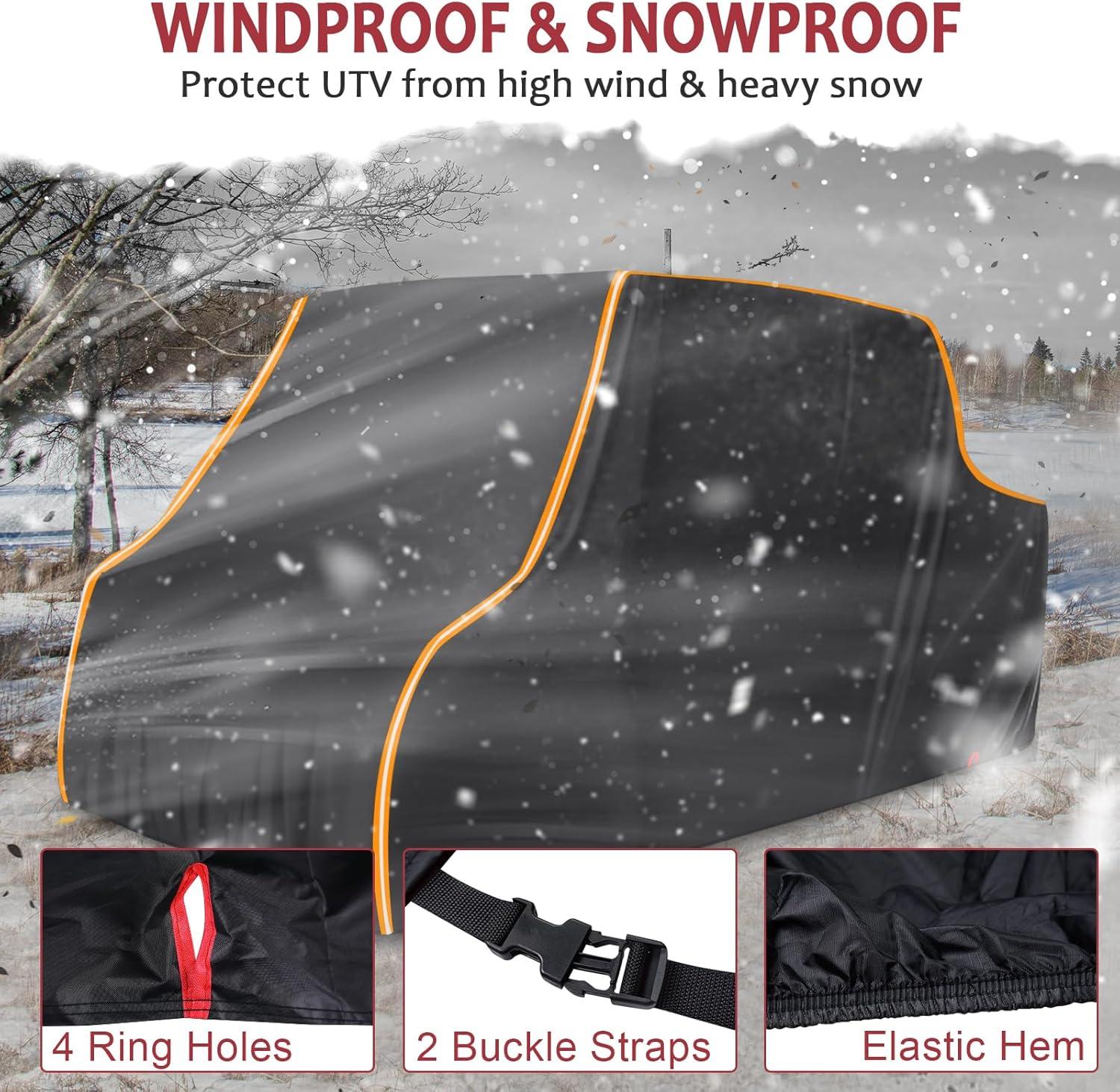 Windproof Cover: The maverick x3 cover can defend against the high wind because we use thick and strong windproof webbings, adjustable elastic hem, and 4 extra windproof buckle straps that fasten to tires, can prevent the cover from blowing off in the strong wind, rainstorms