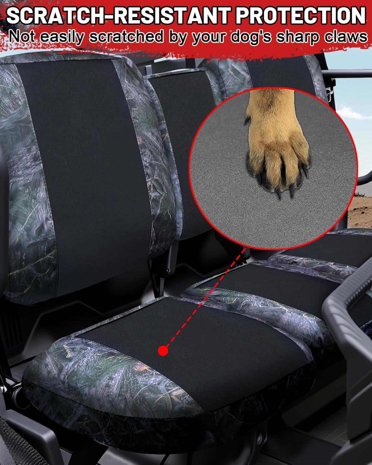 Easy Installation: Scratch-proof seat covers for the defender feature an elastic band along the cover’s edge, with a sturdy buckle strap on the backrest seat covers, and a hook and loop fastener on the bottom seat cover. All these designs make installation a breeze and keep the camo seat covers in place. Even if your dog jumps up and down on the seat, it will never slide