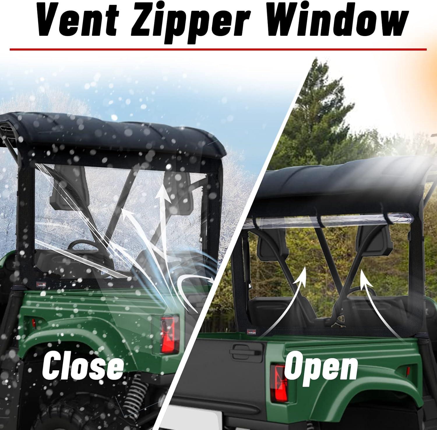 WIDER AIR VENT WINDOW DESIGN – The rhino rear window features a convenient two-way zipper that allows quick venting between clear PVC and waterproof fabric. Stay cool on hot days—just unzip & roll up the rear window for instant airflow while keeping full windshield protection