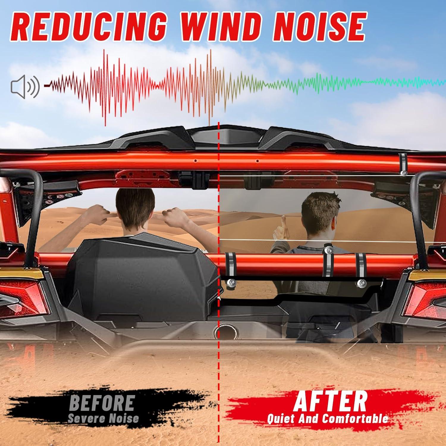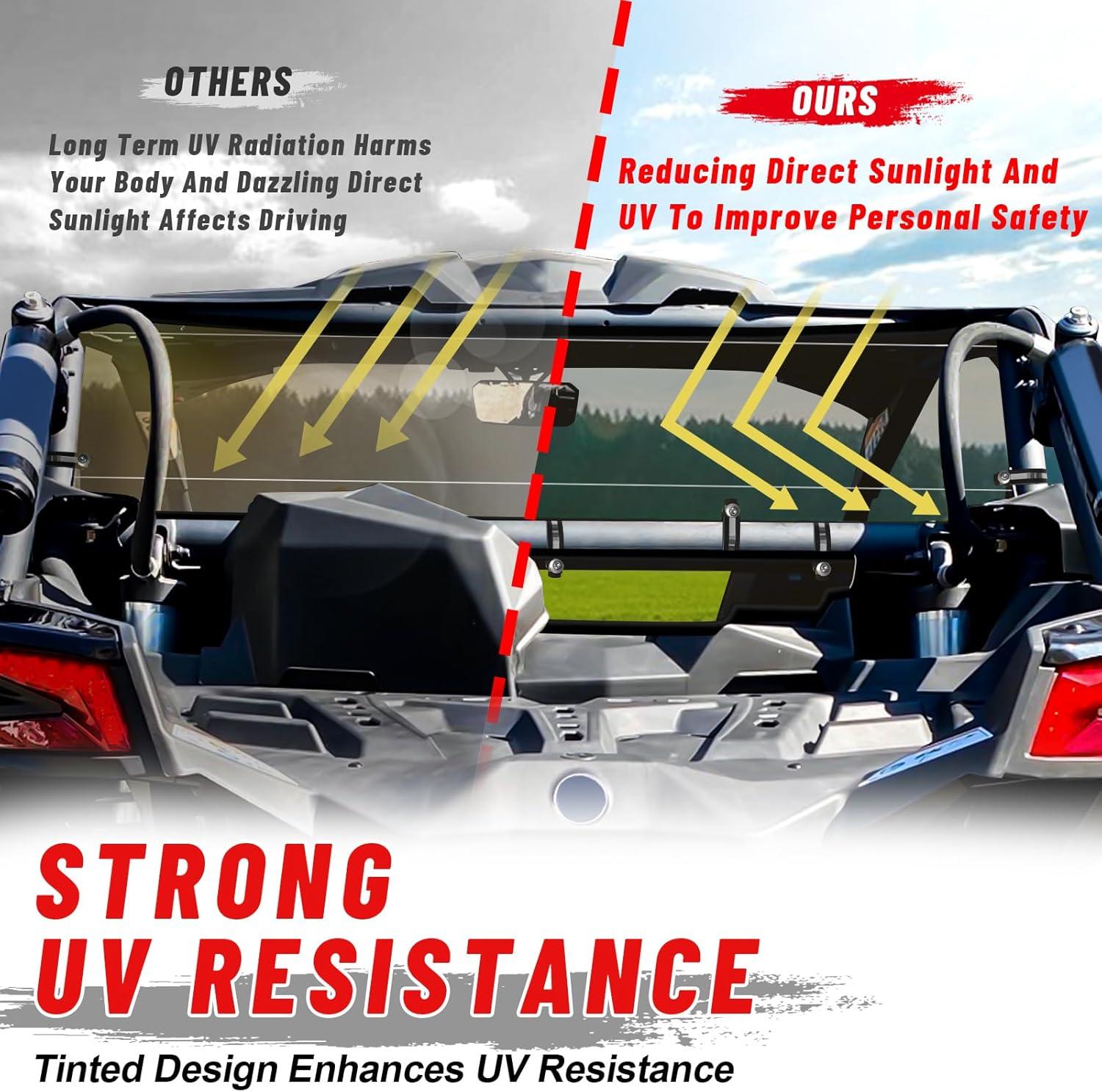 【Noise& UV Reduction】X3 back windshield can effectively reduce the wind noise to provide a much quieter and more comfortable driving environment to you. Besides, the x3 back window is tinted color and with anti-uv treatment, which helps to reduce more than 98% uv ray and damage to your skin. A healthy and enjoyable adventure should get started from installing the x3 max rear windshield.
